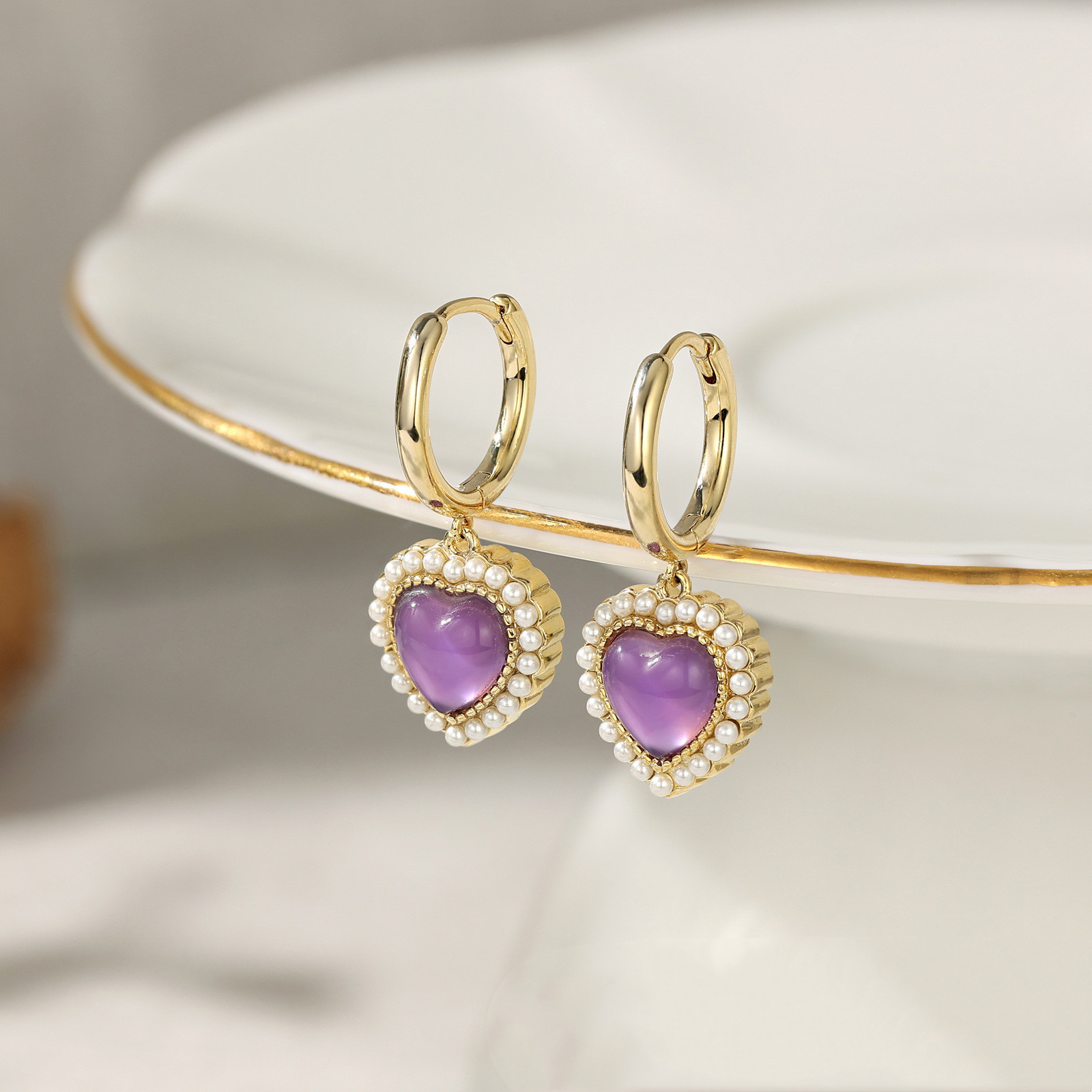French Natural Purple Crystal Retro High Sense Love Heart Stud Earrings