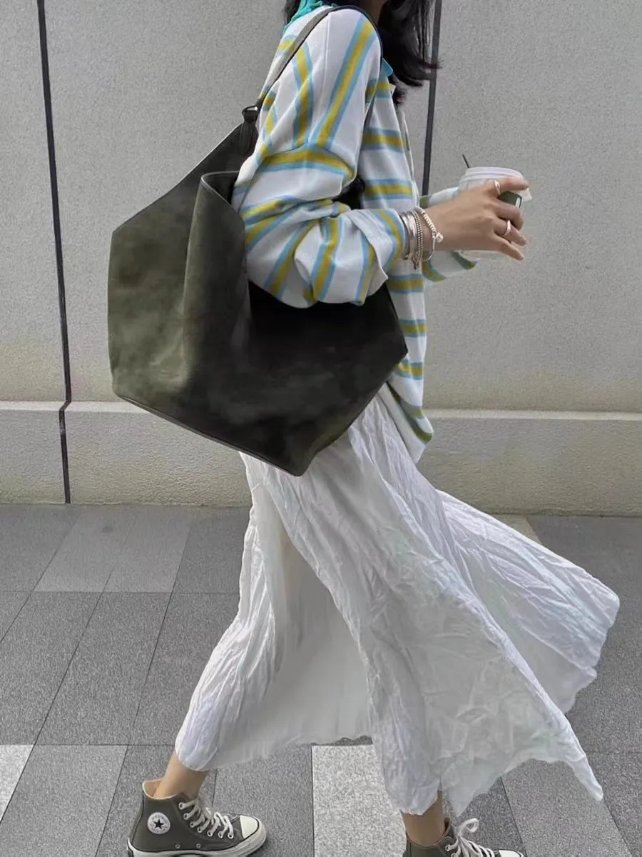 Designed with practicality in mind, the Frosted Cowhide Bucket Bag offers ample storage space for all your essentials. With its large capacity, it easily accommodates everything from your phone, wallet, keys, and makeup, to a tablet, water bottle, or even a small book. Whether you're heading to the office, running errands, or enjoying a day out, this bag will keep your items organized and accessible. The spacious interior ensures you never have to compromise on what to carry, offering plenty of room for your daily necessities.