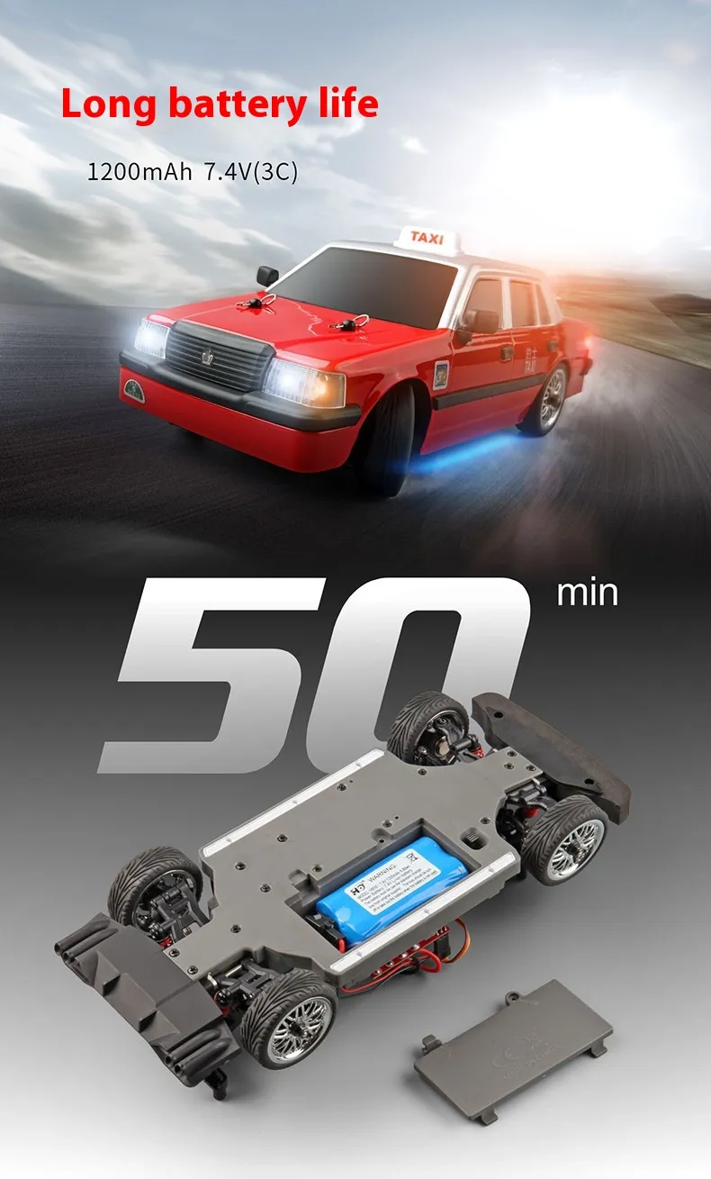 This drift car isn't just about speed—it's about style too. Featuring a full-scale replica of a classic taxi, complete with realistic details such as checkered decals, bright yellow paint, and taxi signage, this car stands out from other RC models. It’s perfect for collectors or anyone who appreciates unique, eye-catching RC cars. Its attention to detail and lifelike design make it a standout piece, whether it’s on display or racing through your local race track.