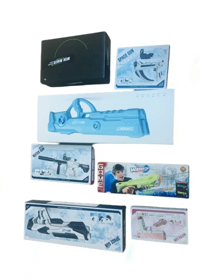 4. For the water guns: they come with all necessary components. You can use your own plugs at home to charge the batteries. Spare plugs are available for an extra charge