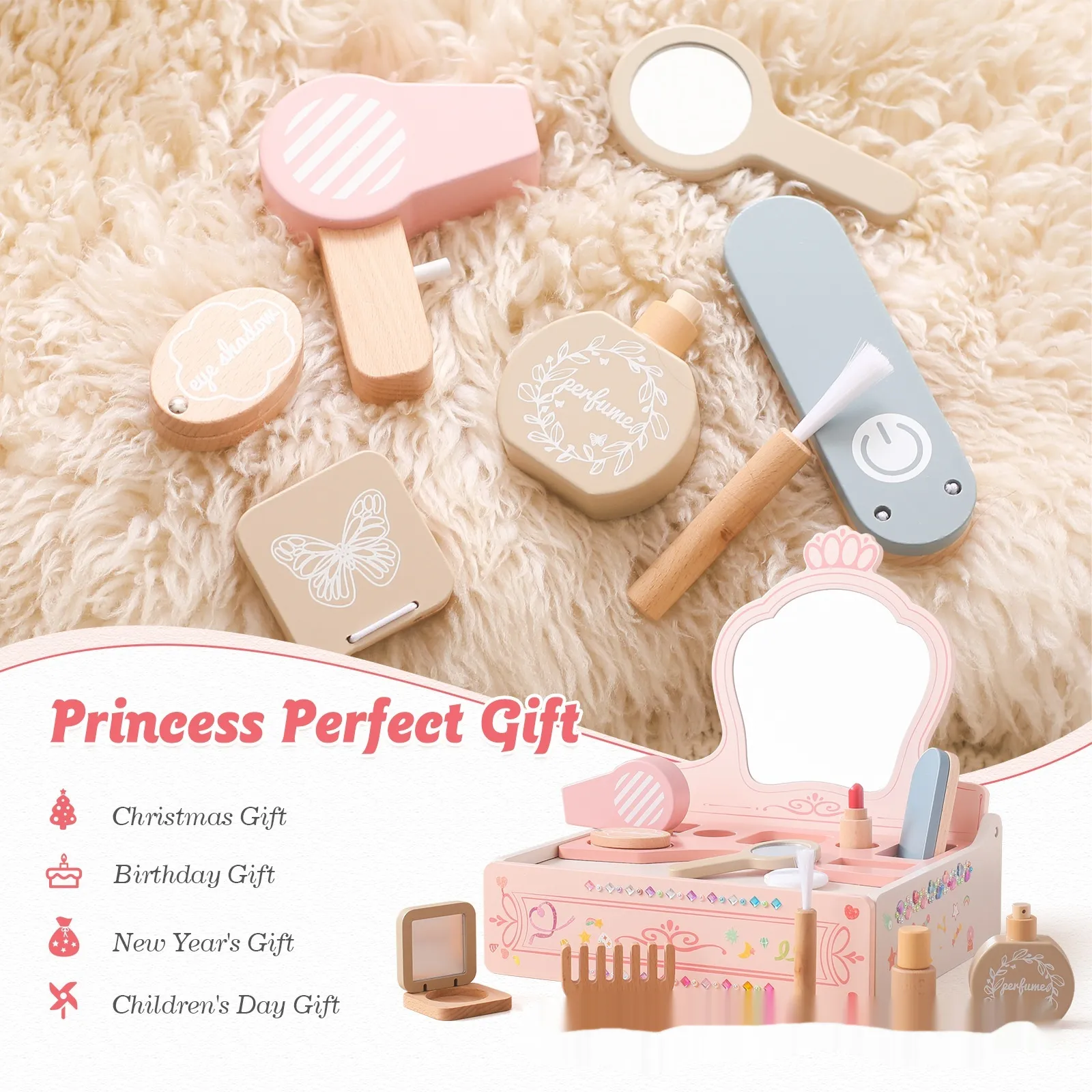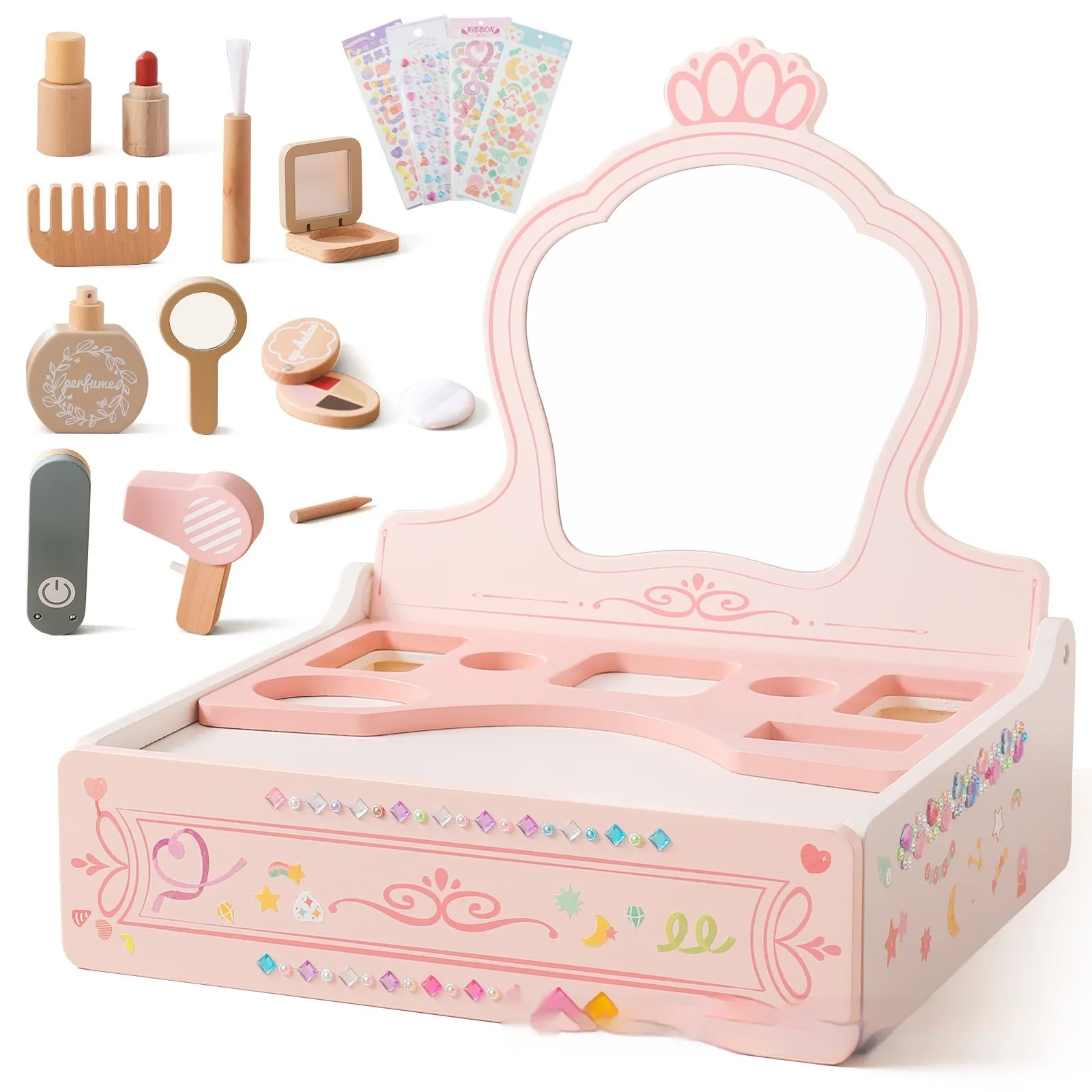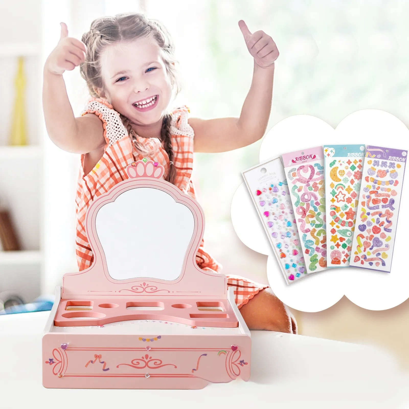 Girl Princess Play House Makeup Toys Small DreGirl Princess Play House Makeup Toys Small Dressing Table Wooden Children's Pink Mirrorssing Table Wooden Children's Pink Mirror