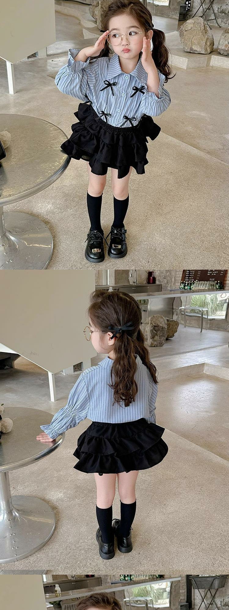 Color: black two-layer skirt blue striped butterfly shirt, blue striped butterfly shirt, black two-layer skirt