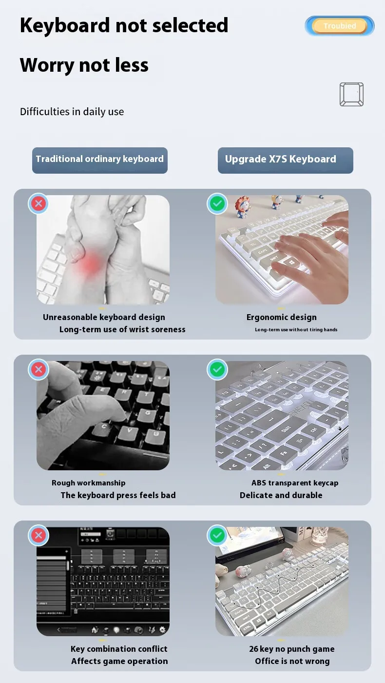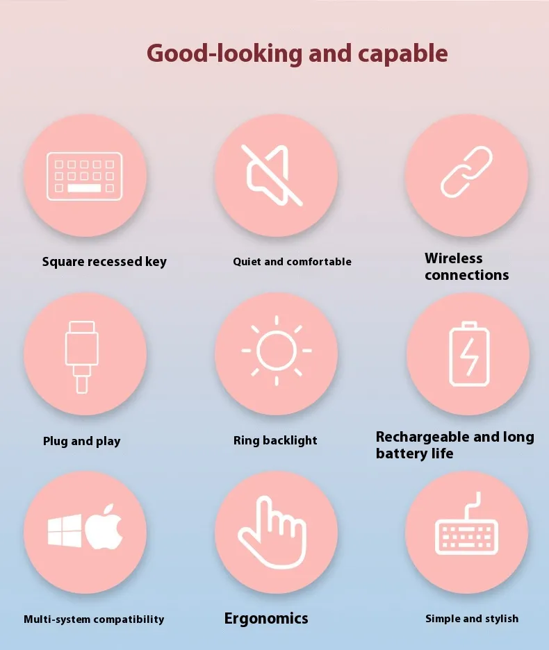 In conclusion, the Good-Looking Wireless Mute Bluetooth Keyboard offers an ideal balance of style, comfort, and performance. Its silent keys, wireless Bluetooth functionality, and sleek design make it a standout choice for professionals, students, and gamers alike. Whether you need a keyboard for your home office or for use on the go, this keyboard provides the perfect blend of practicality and elegance, helping you work efficiently without the distraction of noise.