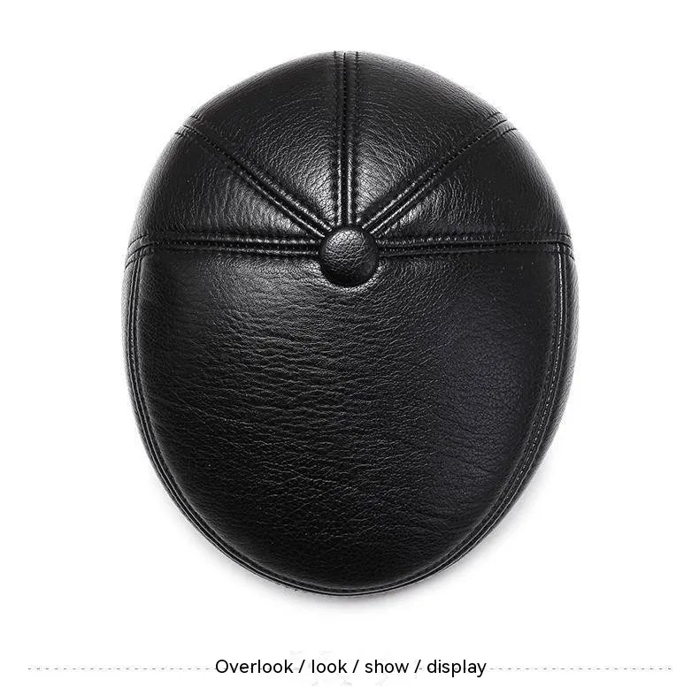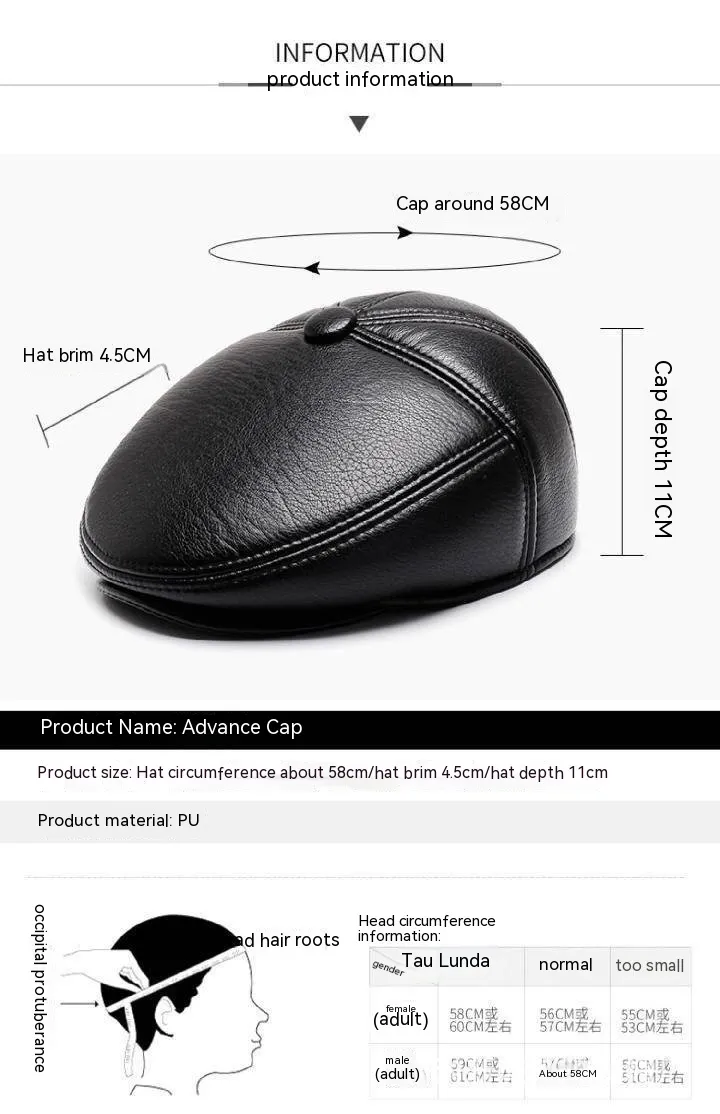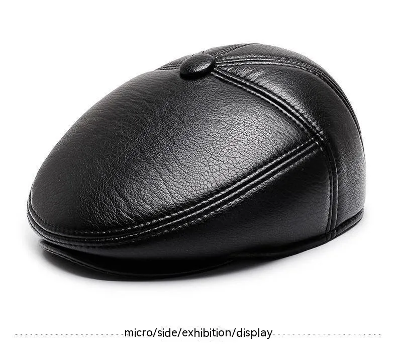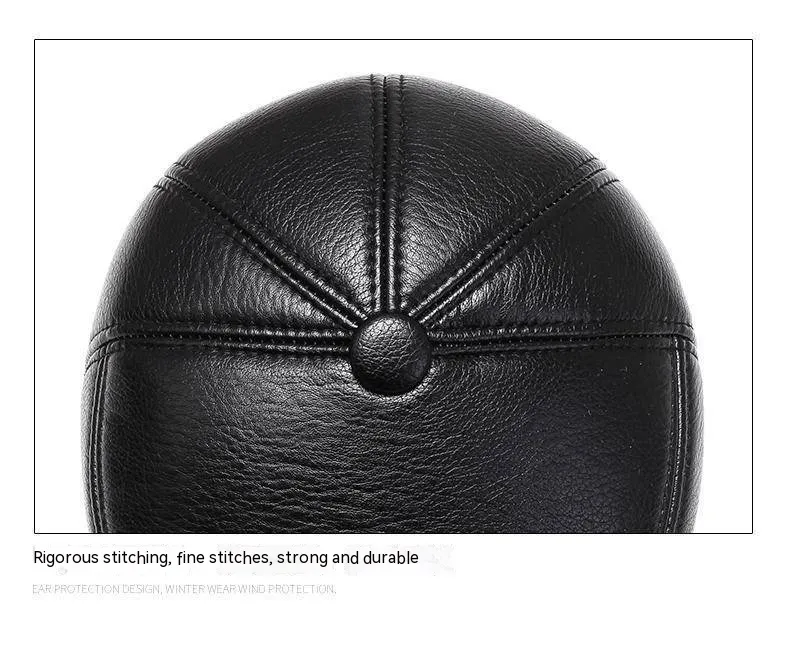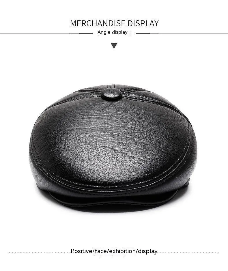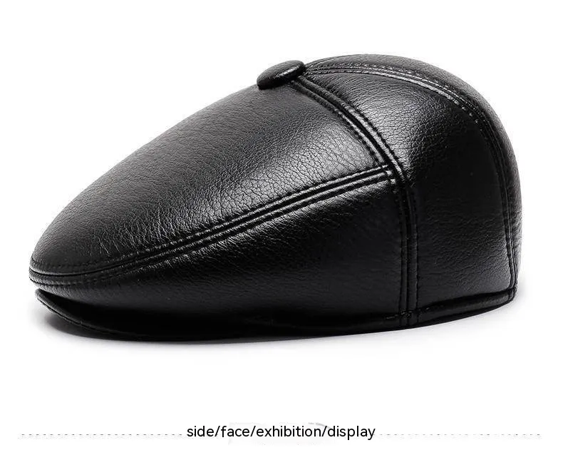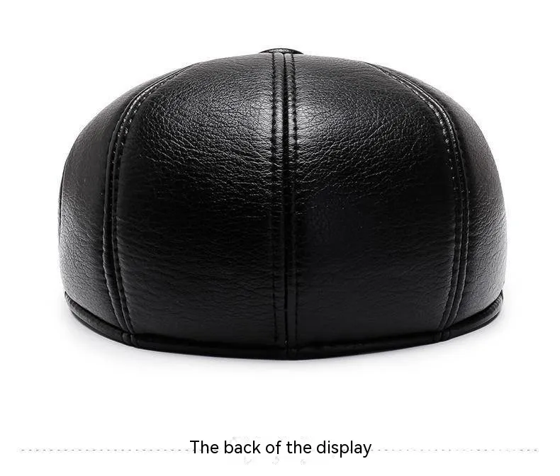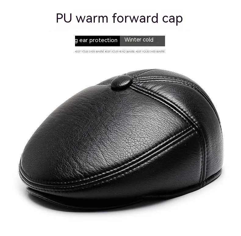 Grandpa Leather Hat Men's Autumn And Winter Fleece-lined Warm Leisure PU Ears Protection Peaked Cap