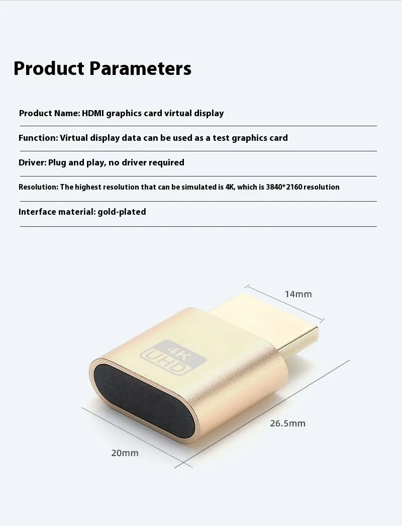 The Graphics Card Spoof HDMI Fake Load is engineered to simulate a connected display when no monitor is physically attached. This feature is perfect for users who need to keep their system running or perform remote tasks without a physical display. The virtual display feature tricks your system into believing that a display is connected, allowing for normal system operation, including screen locking, virtual desktops, and HDMI or VGA tasks, without the need for an actual monitor.
