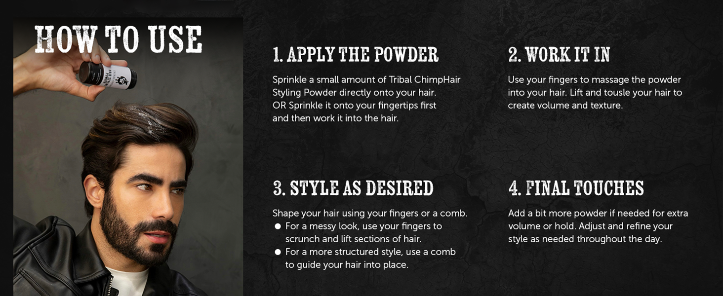 - Boost Your Hair Style: Achieve effortless volume and texture with this Tribal Chimp hair styling powder for men and women. Designed for all hair types, it provides a 24-hour invisible hold, making it the perfect choice for volumizing hair product lovers. Its non-sticky formula ensures a matte finish, giving you a natural look without weighing your hair down. Elevate your look with this must-have hair styling powder.