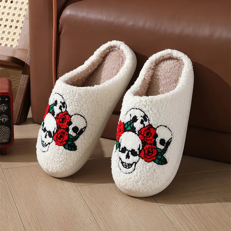 Halloween Skull Rose Slippers Winter Warm Indoor Floor Bedroom Home Slipper For Women