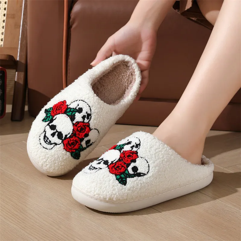 Halloween Skull Rose Slippers Winter Warm Indoor Floo