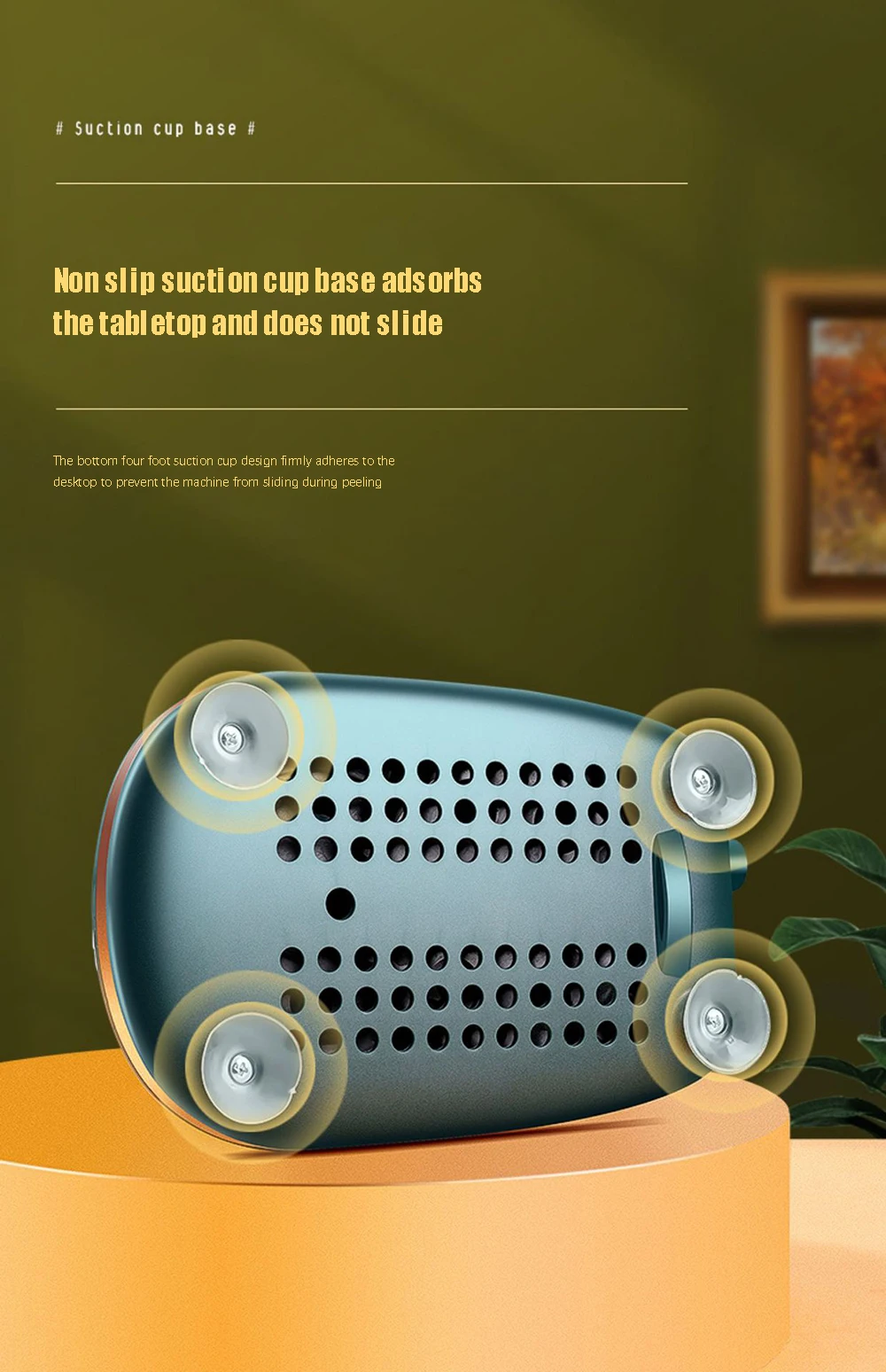 - The four-legged suction cup design at the bottom firmly adheres to the desktop to prevent the machine from sliding when peeling.