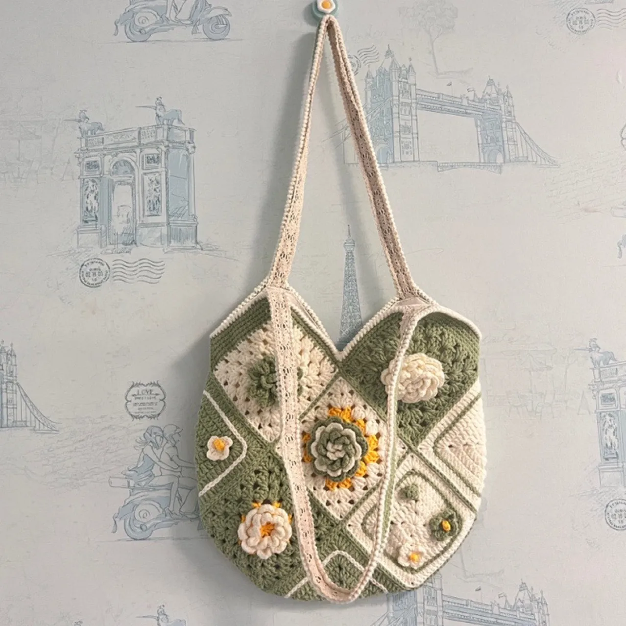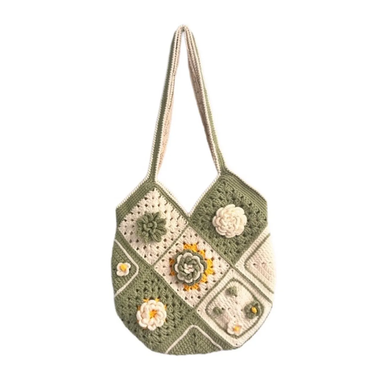 Handmade Knitted Messenger Bag Handmade Wool Crocheted Grandmother Plaid Flower Bag