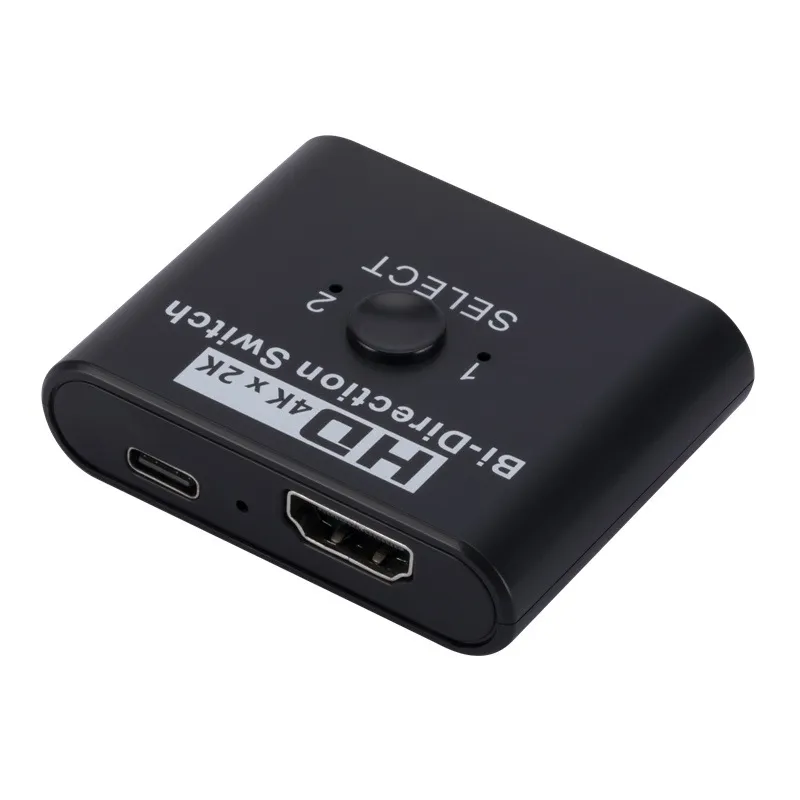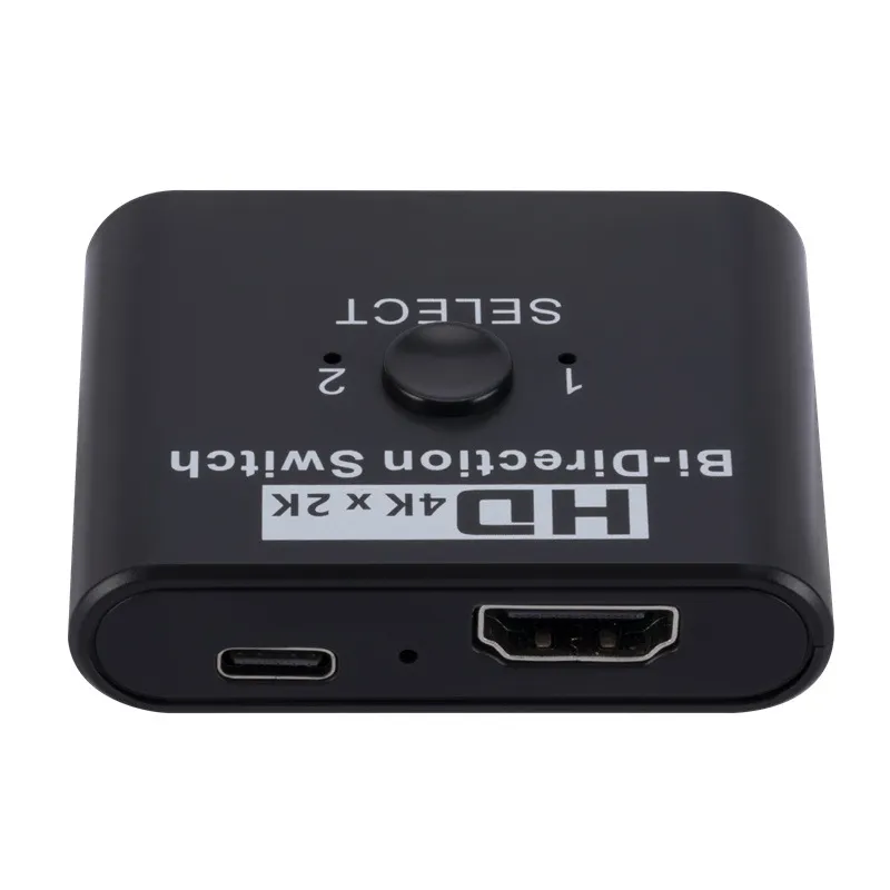 - Two-way HDMI switcher with a switch button and two LED indicators on the top. This button actually allows you to select one of the two modes: whether to send signals from one device to the other two devices or in another way. This means that the switch is bidirectional-HDMI signals can go either way.