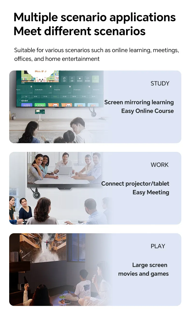 - Use the HDMI Wireless 4K Transmitter for business presentations in conference rooms or meeting spaces, allowing for a clean setup and easy switching between devices.