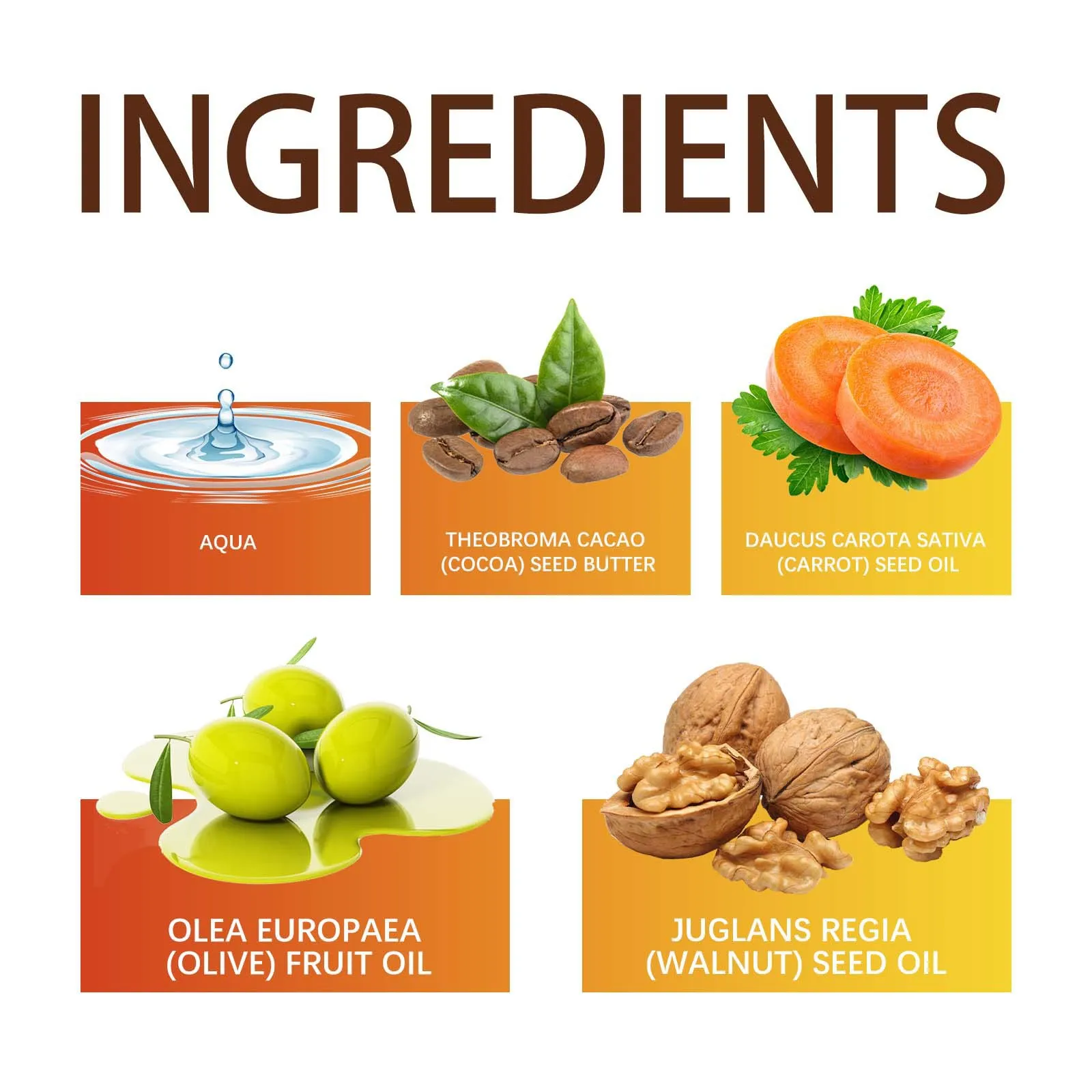 - Ingredients: Water, cocoa seed fat, carrot seed seed oil, olive oil, walnut seed oil