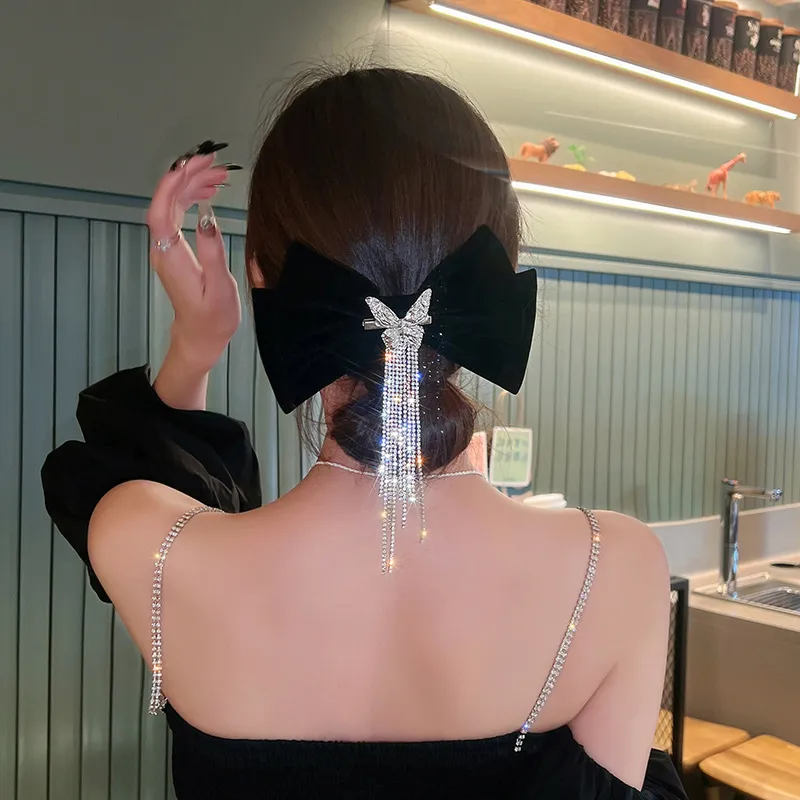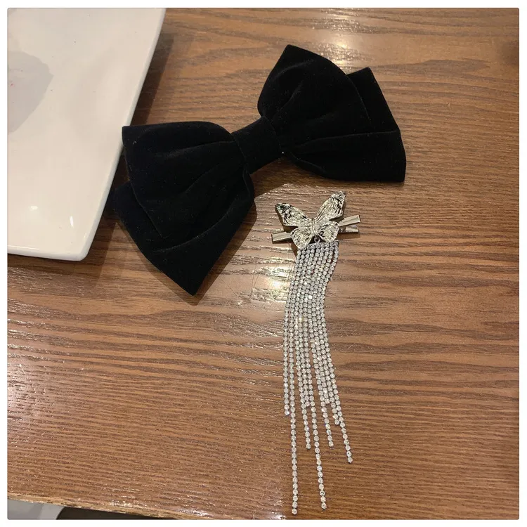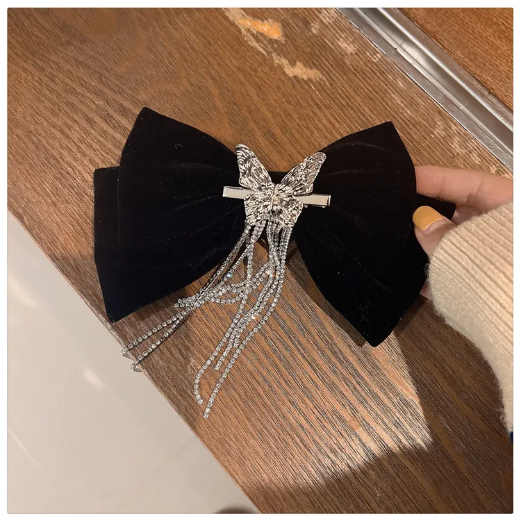 High-end Light Luxury Black Velvet Bow Tassel Hair Clip