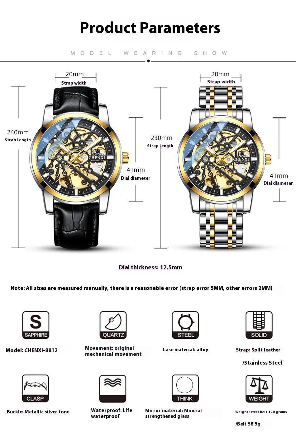 Color: white shell blue white steel belt, white shell green white steel belt, black shell black surface black belt, gold shell gold surface