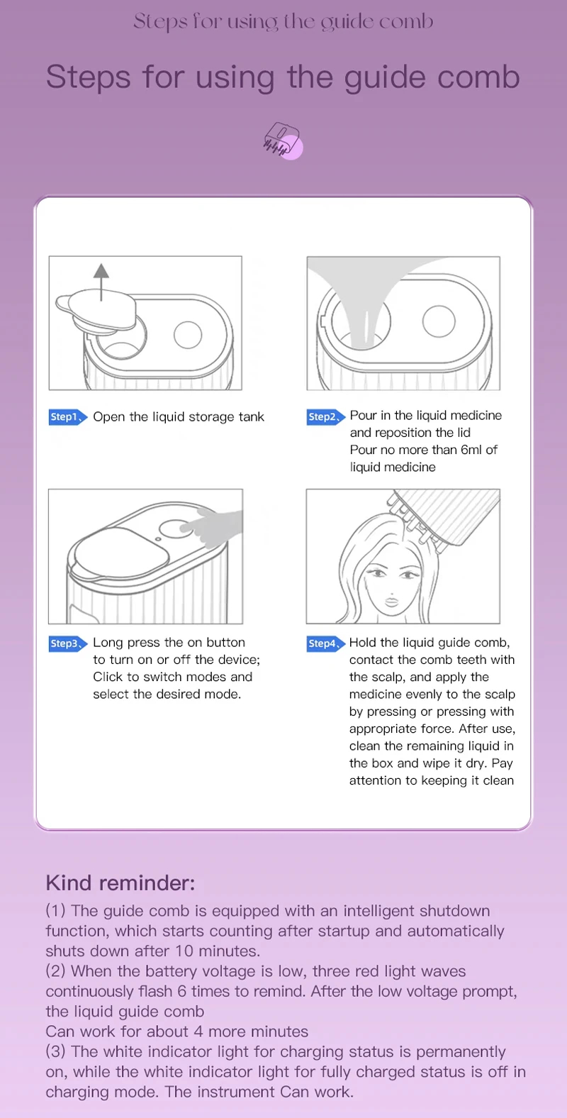3. Three hair care modes (hair growth mode, massage mode, rejuvenation mode) effectively massage and relax the scalp, maintain hair,