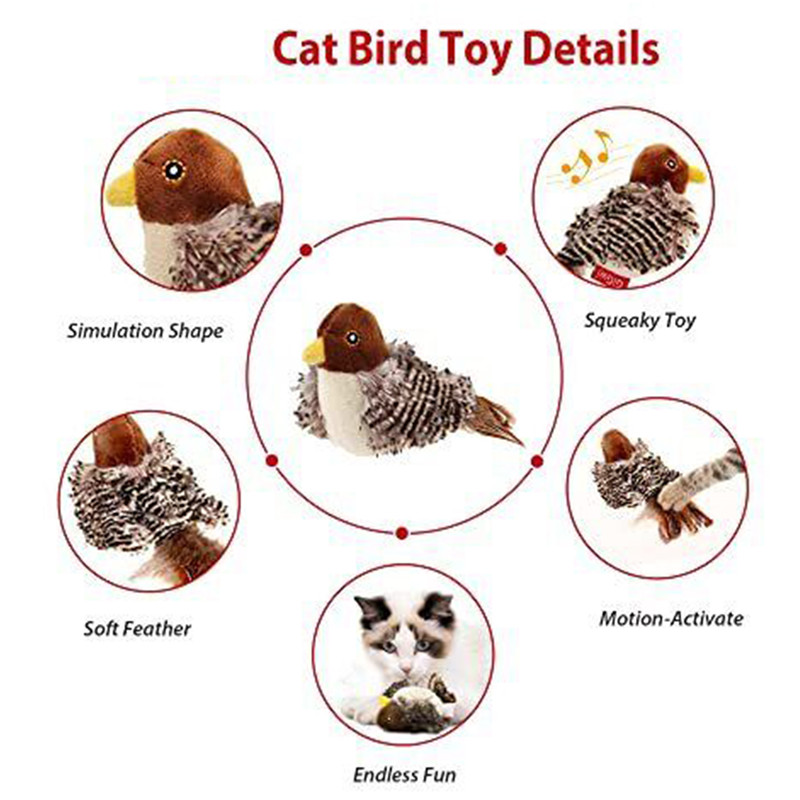Squeaky Cat Toy: The feathered cat toy activates realistic bird sounds when touched, encouraging your cat's natural