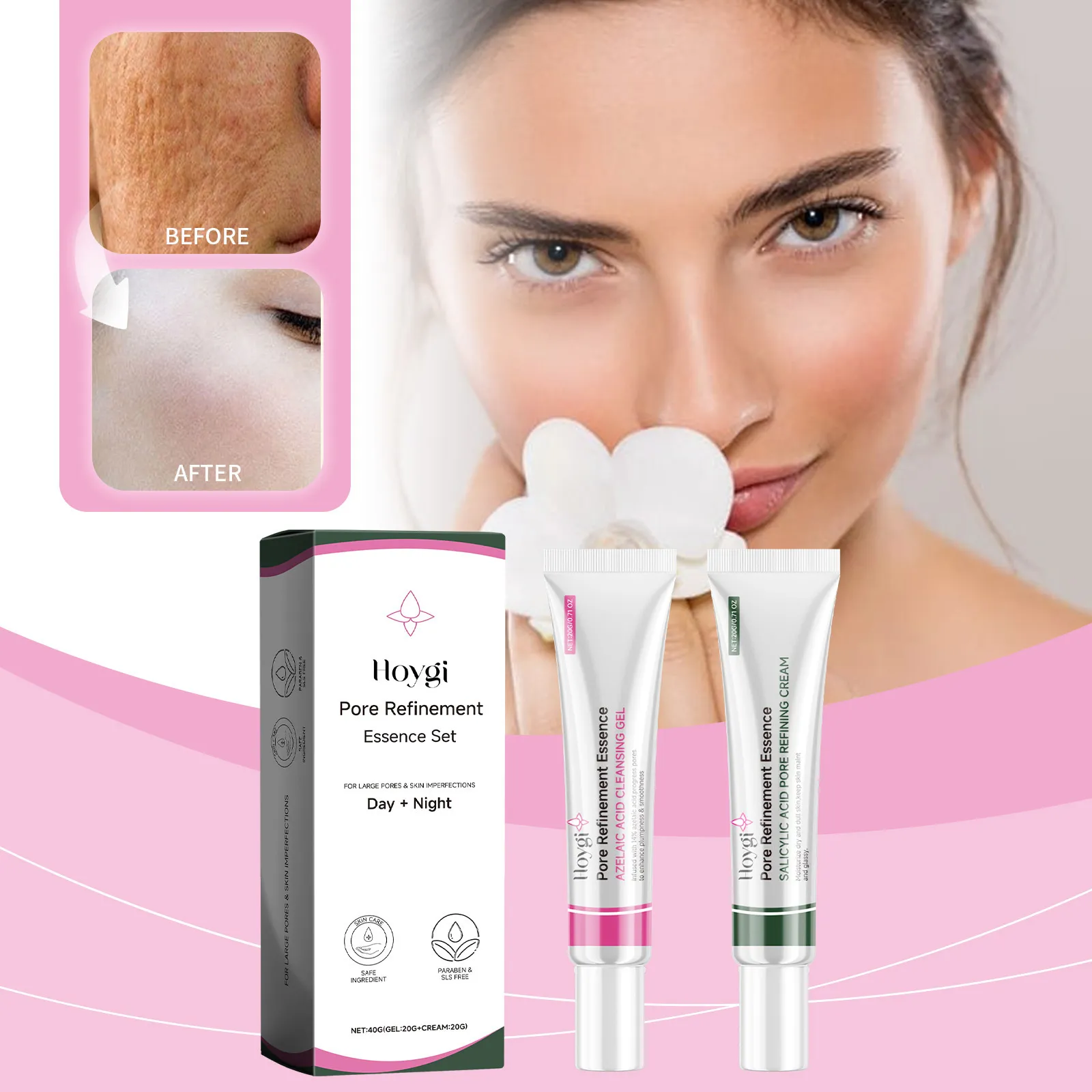 The HOYGI Pore Refinement Essence Set is a two-step skincare system specifically formulated to address enlarged pores, excess oil, and uneven skin tone. This set includes two essential products designed to work synergistically to cleanse, refine, and hydrate your skin. The combination of a gentle cleansing gel and a pore refining cream helps control excess oil, reduce the appearance of pores, and promote a smoother, more even complexion.
