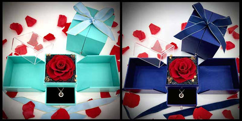 - Color: Tiffany/Royal Blue, clear plexiglass, Red Preserved Rose
