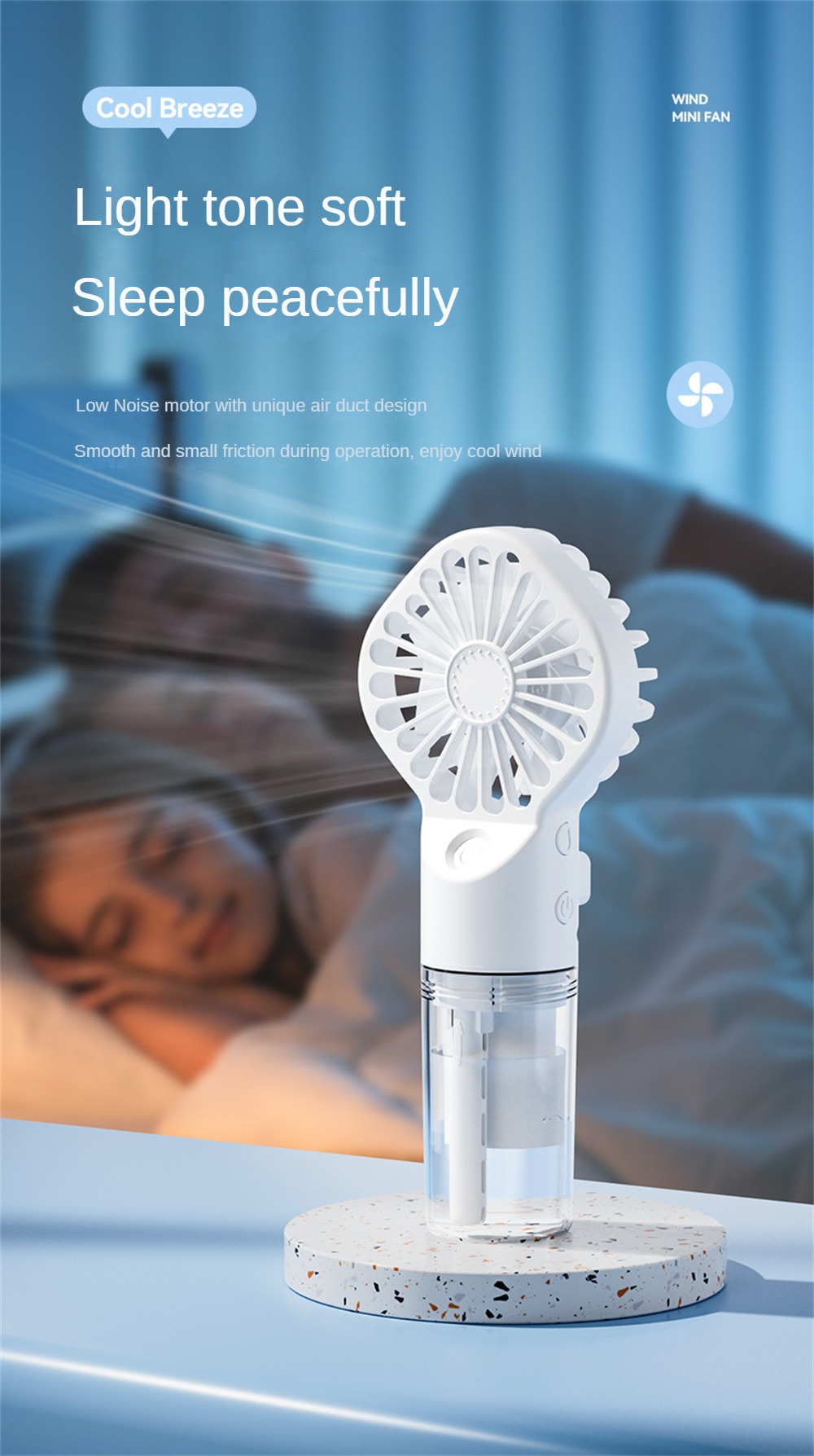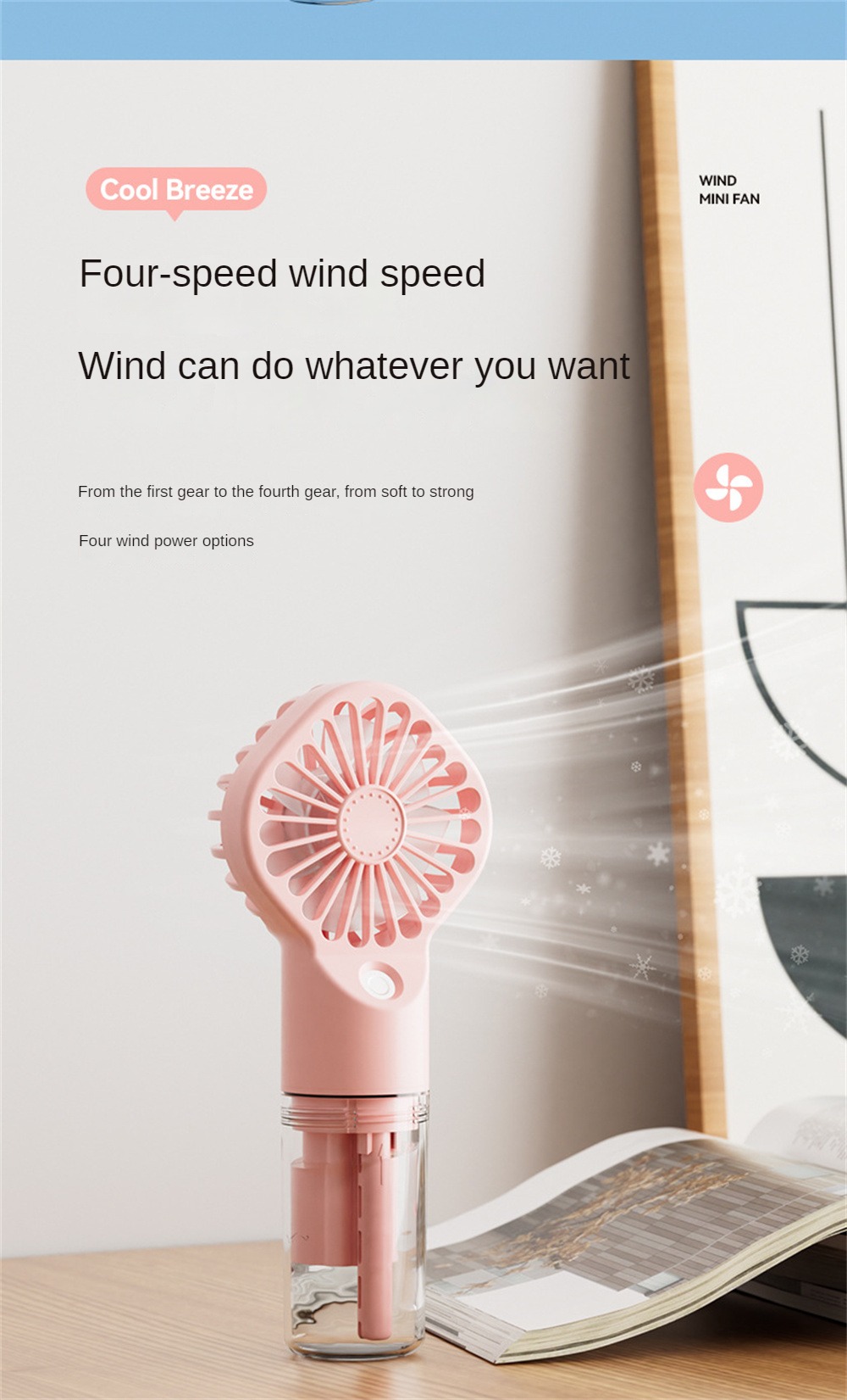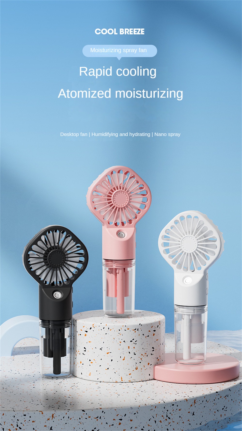 Introducing the "Icy Breeze Portable USB Humidifying Fan" – the ultimate solution for staying cool and refreshed wherever you go. This innovative device combines the functionality of a powerful fan with the soothing effects of a humidifier, ensuring you stay comfortable and hydrated during the hot spring and summer months. Perfect for home, office, or travel, this compact and stylish fan is a must-have accessory for beating the heat.