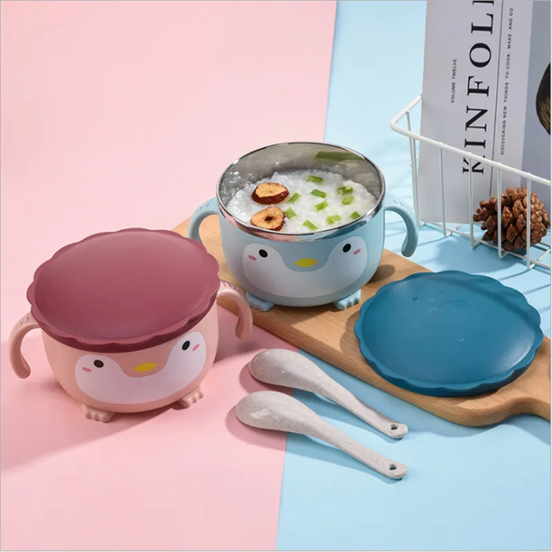 Infant 304 Stainless Steel Tableware Cute Penguin Cartoon Baby Bowl With Handle