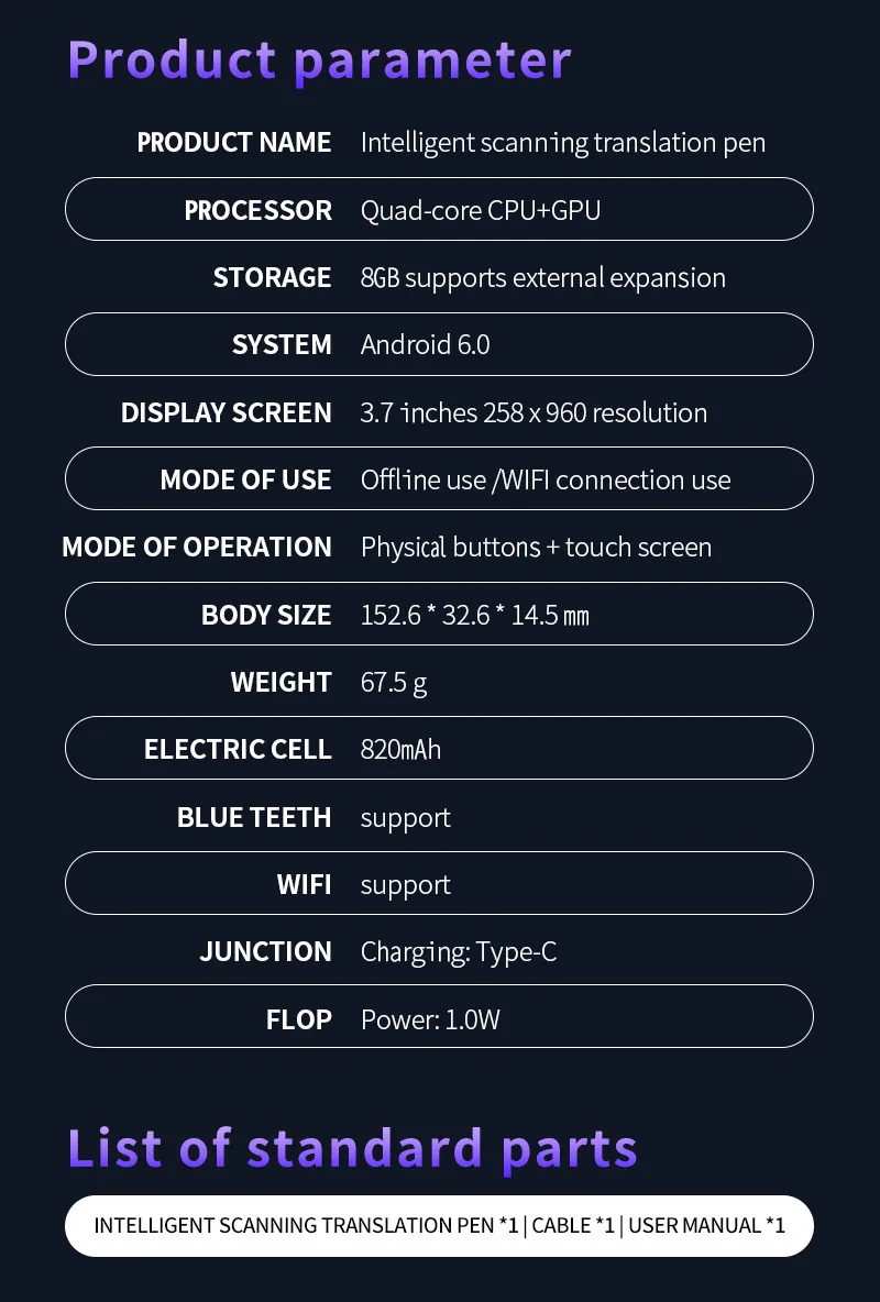 This translation pen is perfect for individuals who often encounter multilingual texts in books, menus, signage, or documents and need a quick, reliable solution to understand foreign languages. Its high precision and user-friendly design ensure that it’s not just an accessory, but a practical tool that enhances communication, learning, and productivity.
