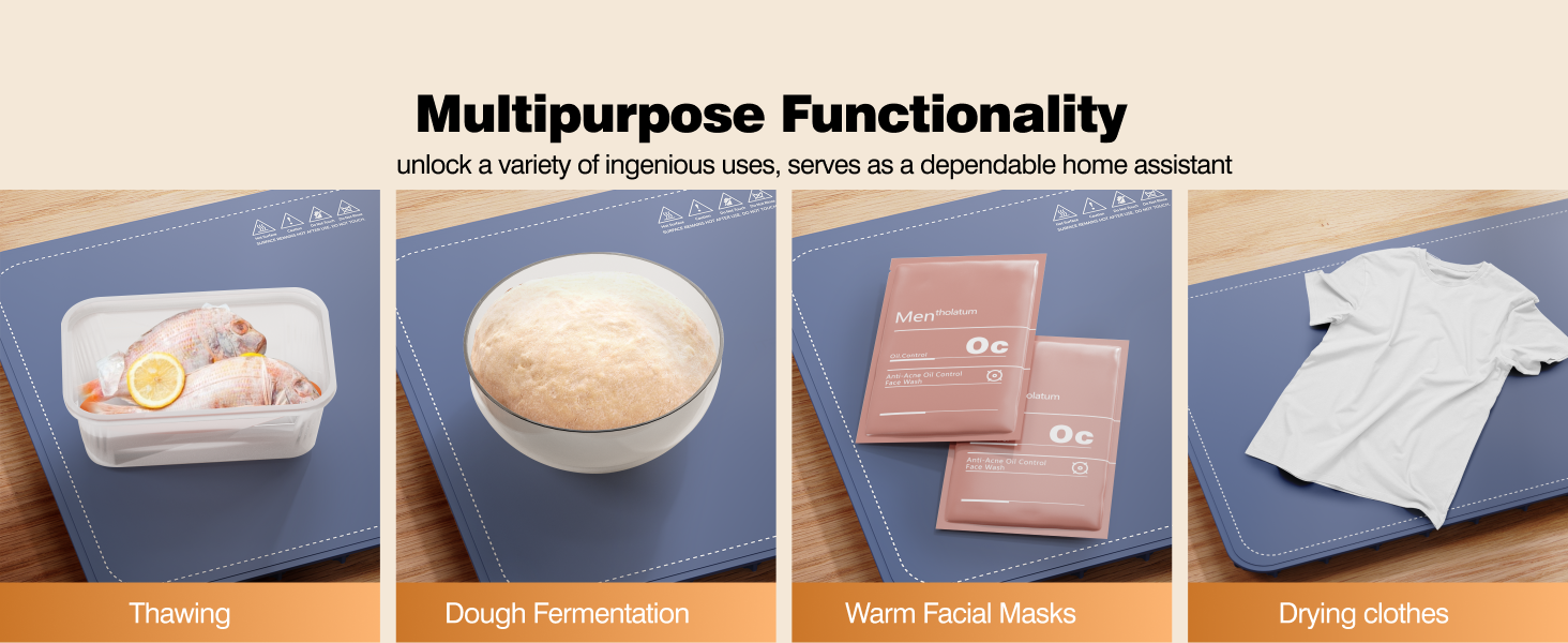 - 【𝐕𝐞𝐫𝐬𝐚𝐭𝐢𝐥𝐞 𝐚𝐧𝐝 𝐄𝐬𝐬𝐞𝐧𝐭𝐢𝐚𝐥】: Besides serving as an excellent food warmer mat for dishes, this portable food warmer is also suitable for heating milk, defrosting frozen food, and drying certain items. It is a versatile and indispensable tool for every household, designed to assist you effortlessly