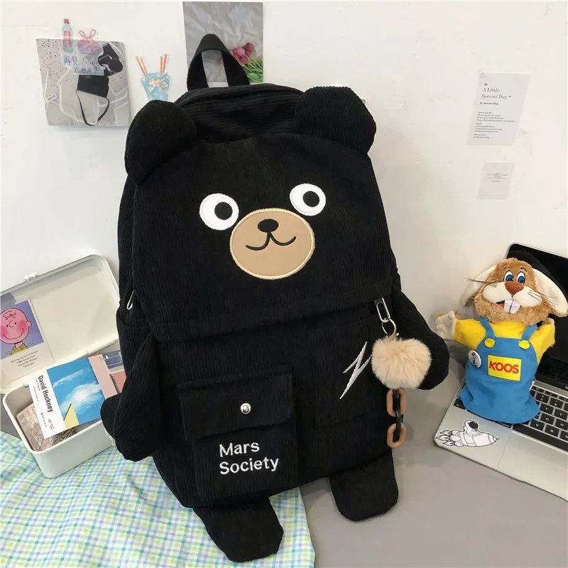 The backpack showcases a charming bear motif that captures the essence of Japanese and Korean minimalist fashion. From embroidered bear