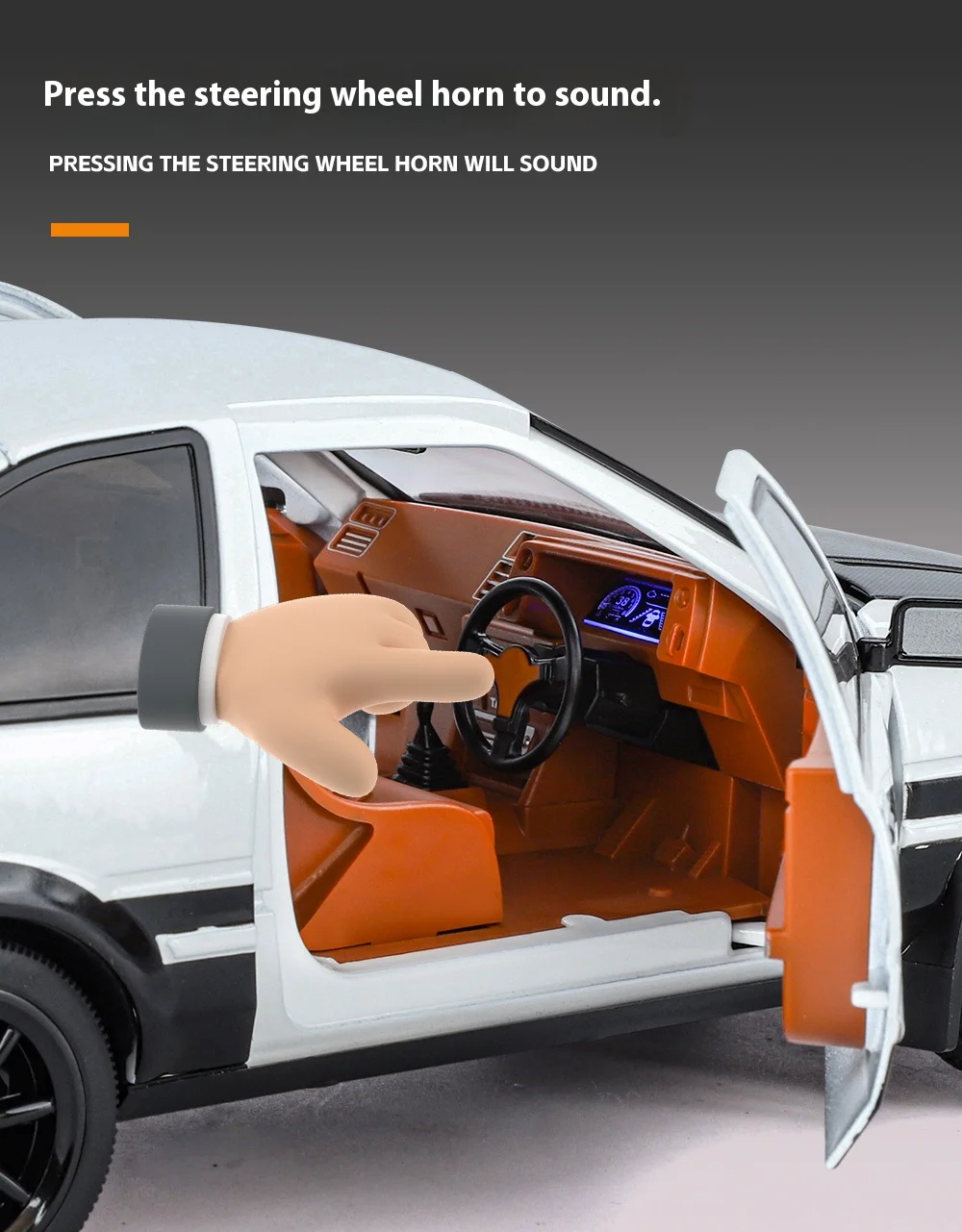 One of the standout features of this model is its detailed exterior. The car’s iconic white and black color scheme, as seen in the Initial D anime, is faithfully replicated, with special attention paid to the iconic TRUENO decals. The doors, hood, and trunk are fully functional, allowing collectors to open them and explore the interior, providing a fully interactive experience. The intricate wheel design, racing tires, and spoiler add to the realism of the model, making it an authentic representation of the car featured in the anime.
