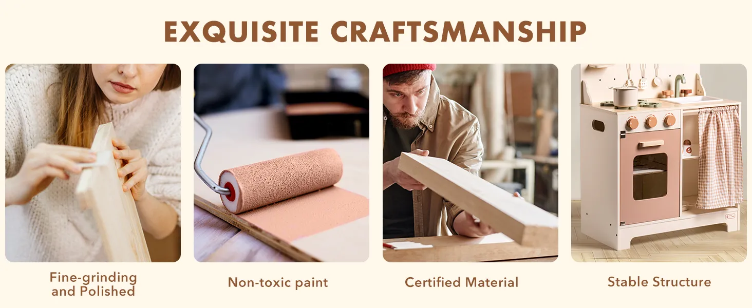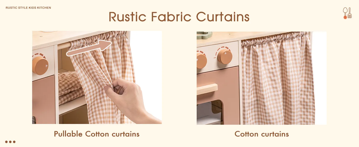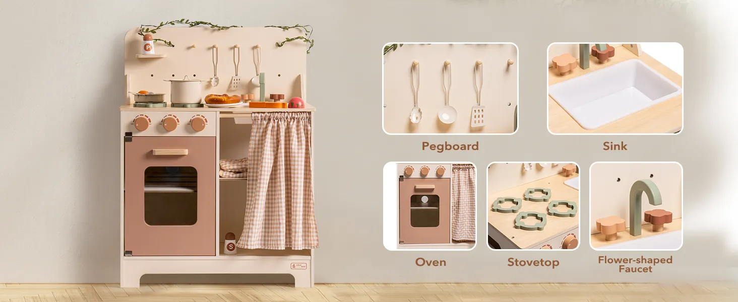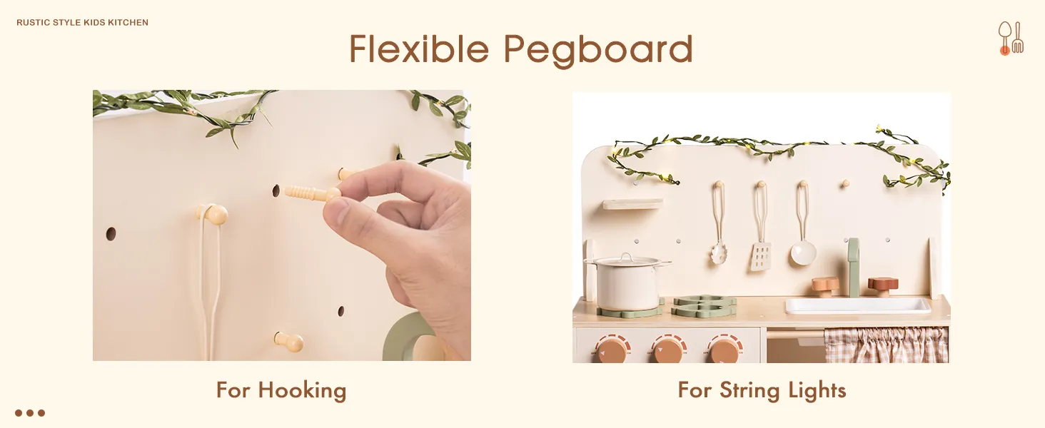 - 【Country Style Children's Kitchen】This children's play kitchen set is known for its unique country style and delicate leaf shaped light strings. There are also a variety of rotating knobs that open and close doors and cabinets, which provide children with an authentic cooking experience.