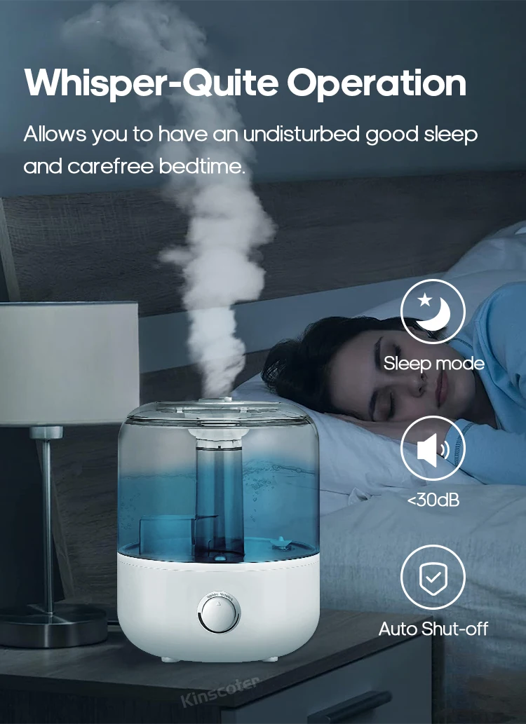 - Improved Air Quality – By adding moisture to the air, the KINSCOTER humidifier helps to alleviate symptoms of dryness, such as dry skin, throat irritation, and cracked lips, creating a more comfortable living environment.
