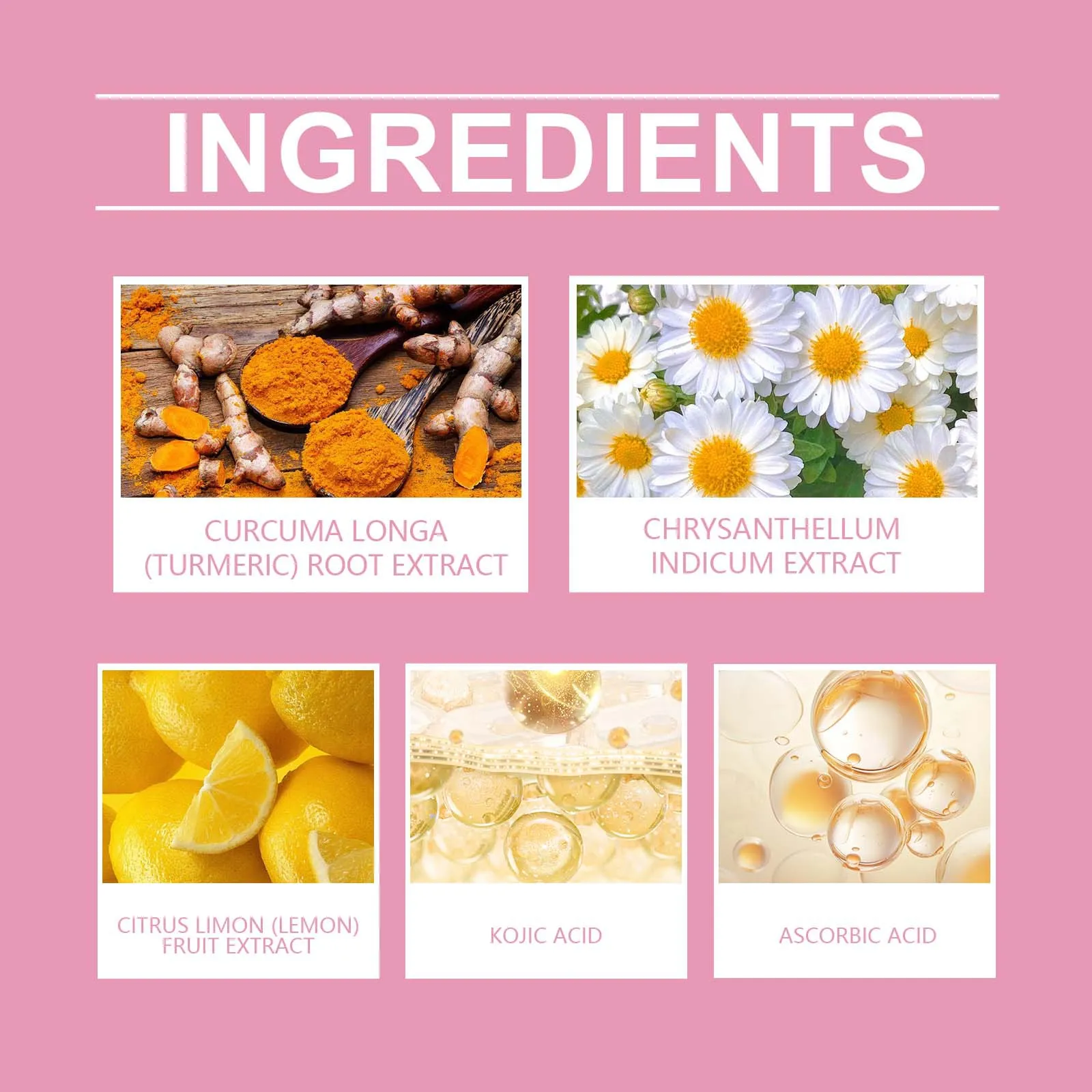 Ingredients: turmeric extracts, kojic acid, chamomile extract, vitamin C, lemon extract