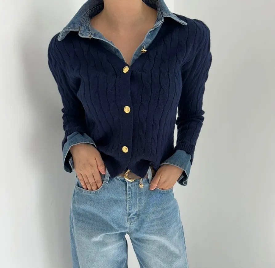 The addition of denim stitching elevates this sweater’s design, giving it a fresh, modern edge. The denim-like finish adds a touch of rugged sophistication, balancing the soft knit fabric. This blend of materials creates a visually interesting contrast, making the sweater both comfortable and stylish. Whether paired with jeans, skirts, or leggings, the denim stitching detail enhances the overall look.