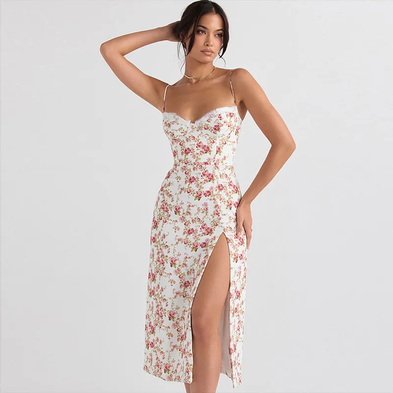 Comfort and Fit The Lace Flowers Print Long Dress is designed with both comfort and style in mind. The lightweight fabric is breathable, ensuring that you stay cool even on the hottest summer days. The suspender-style straps are adjustable, allowing you to tailor the fit to your body. The dress flows gracefully down the body, accentuating your natural curves while providing a relaxed and comfortable fit. The slit adds just the right amount of flirtatiousness, making it perfect for both day and night events.