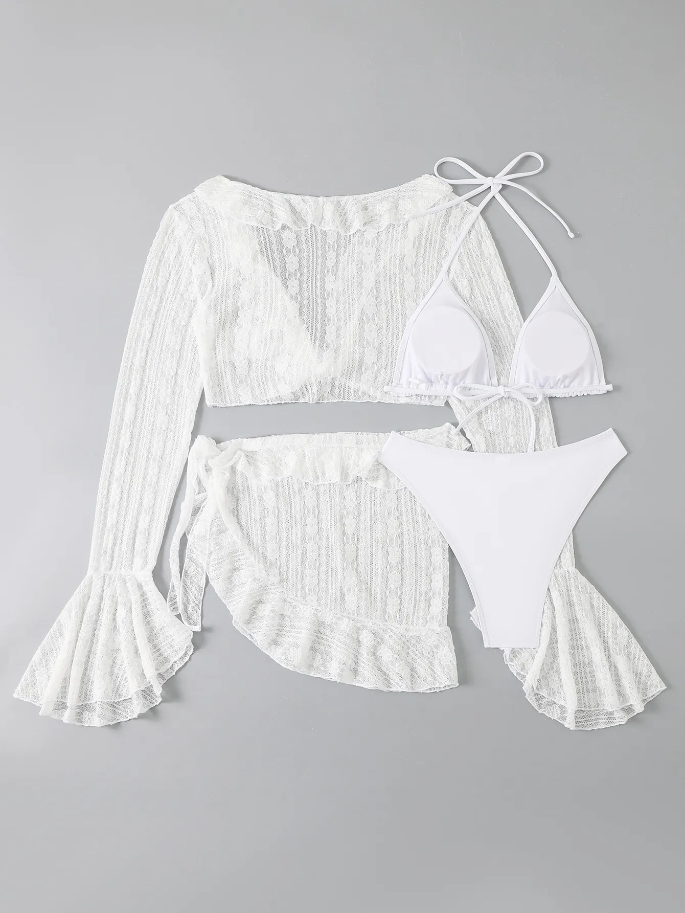 Four-Piece Set: Includes the lace long sleeve cardigan, bikini top, bikini bottom, and an additional piece (such as a