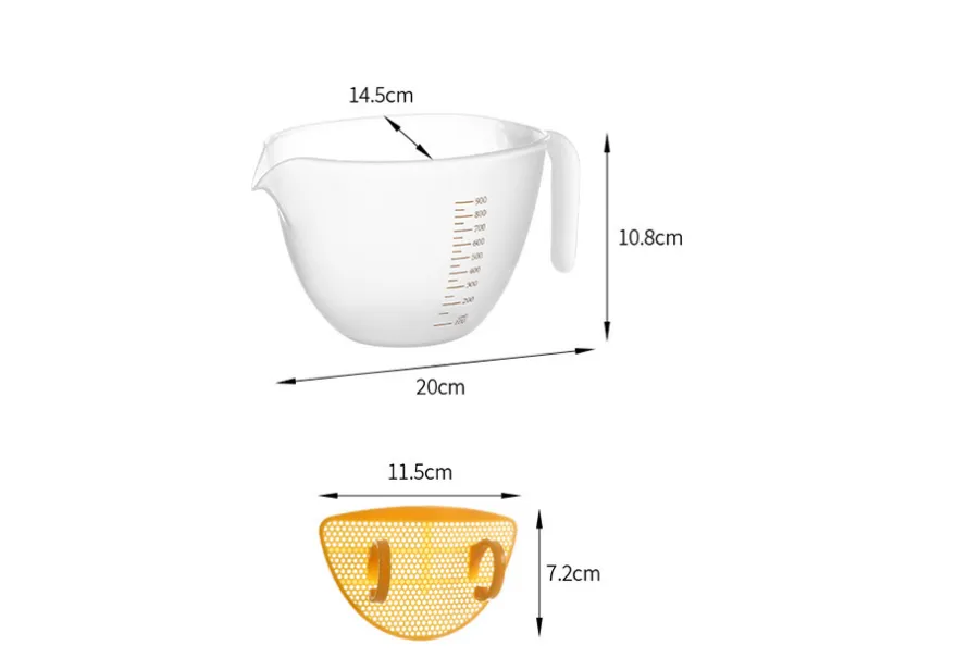 The capacity of the product is 1000ml. The length of this liquid mixing bowl is 20cm, the width is 14.5cm and the height is 10.8cm.