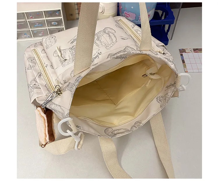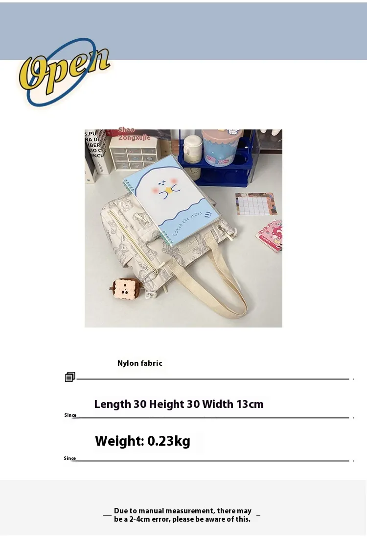 This tote bag is adorned with a charming bear print that adds a playful touch to any outfit. The nylon material ensures durability while remaining lightweight. The bag includes multiple pockets, making it easy to stay organized. Whether you're carrying essentials like your phone, wallet, and keys or larger items such as books or a tablet, this tote has you covered.