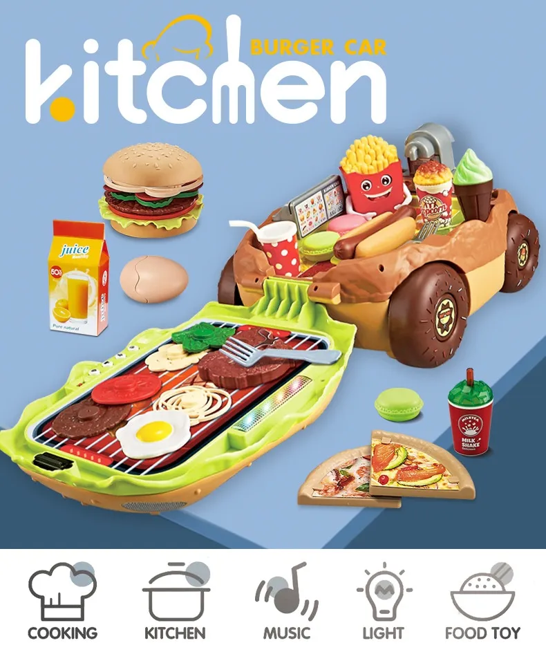 The Large European and American Children Play House Kitchen Toy Hamburger Barbecue Cooking Kitchenware Tableware Sales Pushcart is a versatile and fun playset that brings the excitement of cooking and serving to life. Designed for young chefs, this toy kitchen features a hamburger and barbecue setup, complete with kitchenware, tableware, and a mobile pushcart. With its vibrant colors and realistic features, this playset provides an immersive role-playing experience that promotes creativity, teamwork, and social skills. Ideal for children who love to pretend cook, serve, and host, this playset is the perfect addition to any playroom.