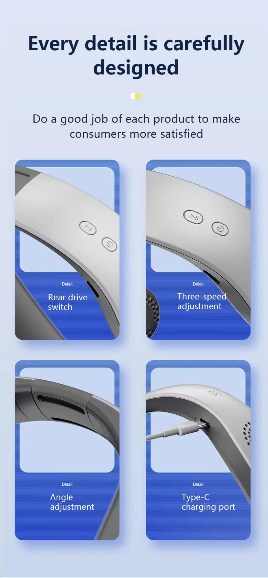1. The unique design of the portable neck fan is inspired by earphones. It only needs to be hung around the neck to free your hands, and it