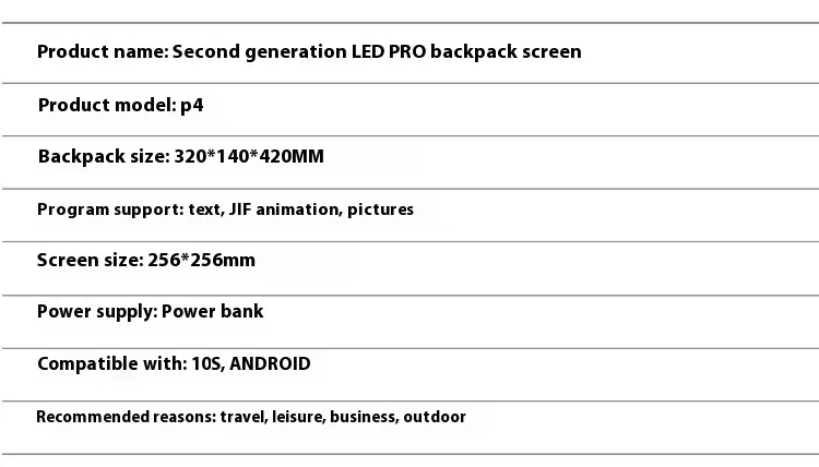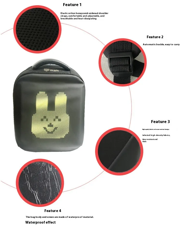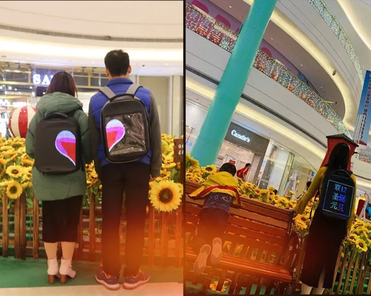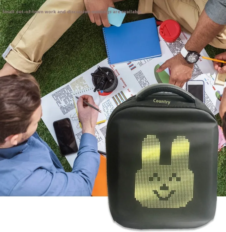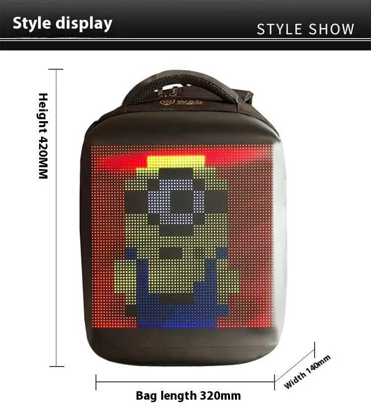 this innovative backpack features a built-in LED screen controlled via mobile phone and WiFi. Perfect for businesses, events, or personal