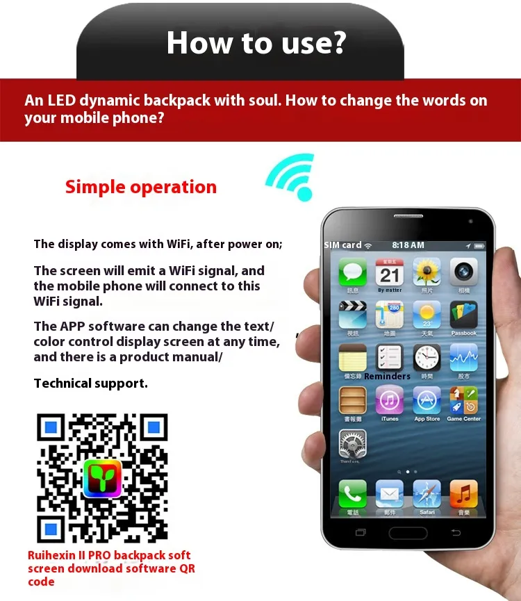 this innovative backpack features a built-in LED screen controlled via mobile phone and WiFi. Perfect for businesses, events, or personal