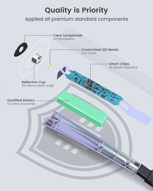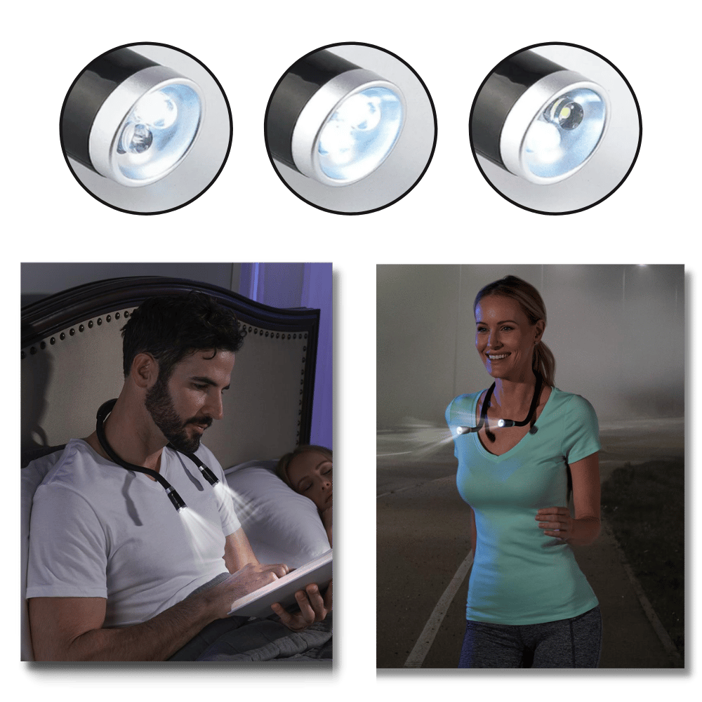 No flickering and blue light filter design with advanced LED beads. No eye strain any more for both kids and adults. The arms are supple and adjustable so you can get the angle most comfortable to you. Ergonomic neck around design, and it is totally hands free!