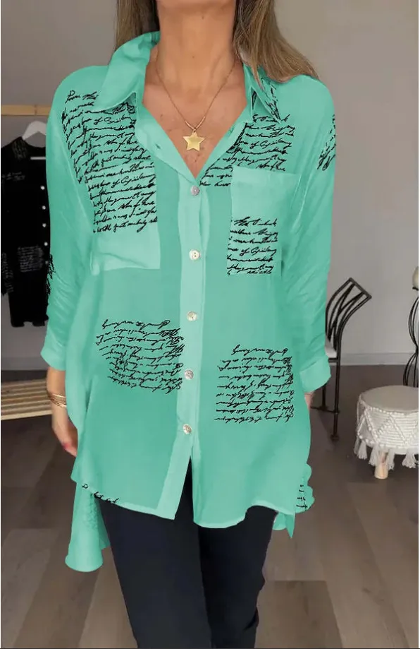 Comfort and Fit The Letter Print Long Sleeve Shirt is designed for comfort without compromising on style. The relaxed fit allows for easy movement, making it perfect for a busy day at the office or running errands. The button-up front allows you to adjust the neckline to your preference, while the structured collar adds a touch of elegance. This shirt flatters all body types and can be easily tucked into trousers or worn loose over jeans for a more casual look.