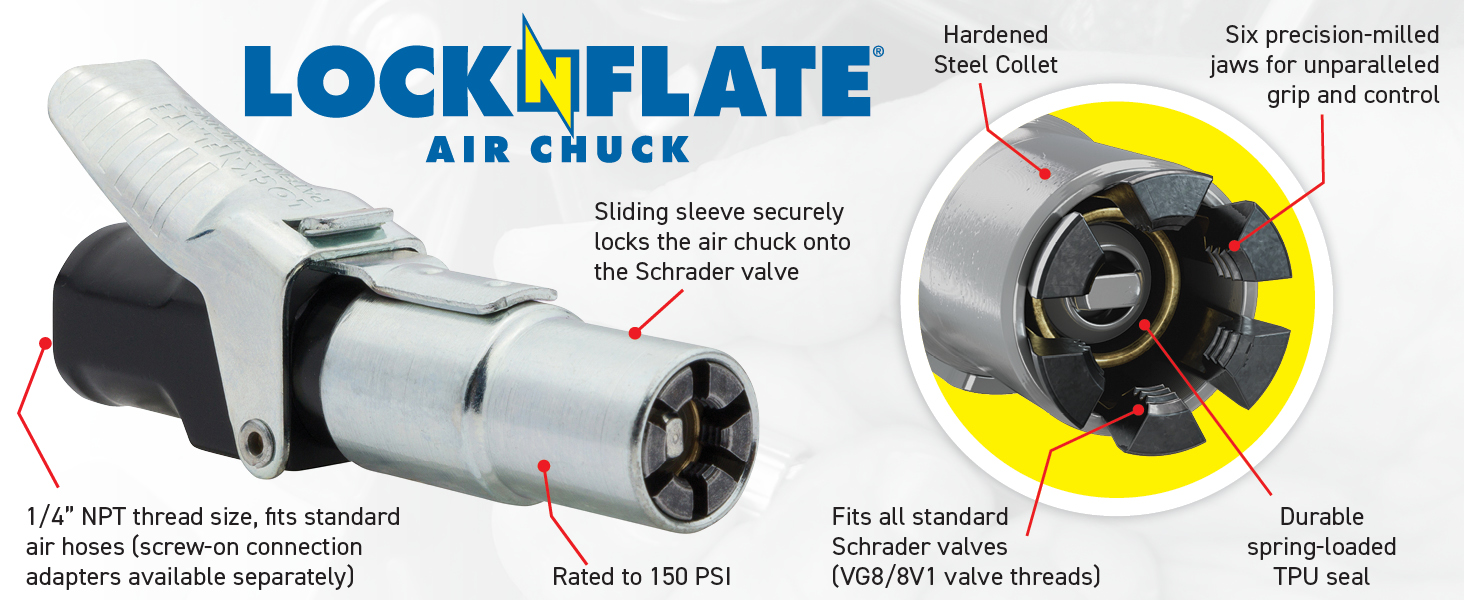 The LockNFlate® Locking Air Chuck is an innovative solution designed for anyone who needs reliable and efficient tire inflation.