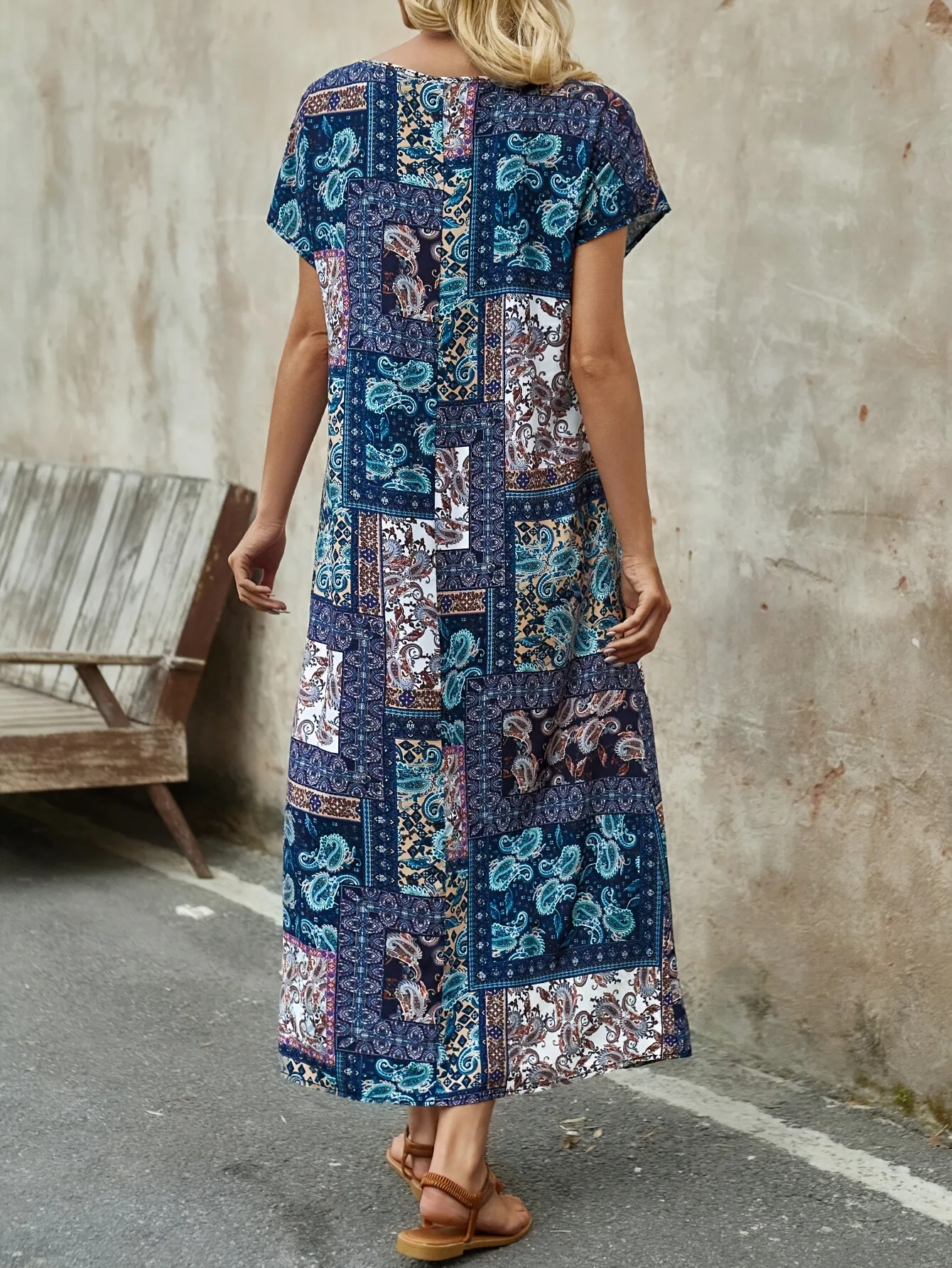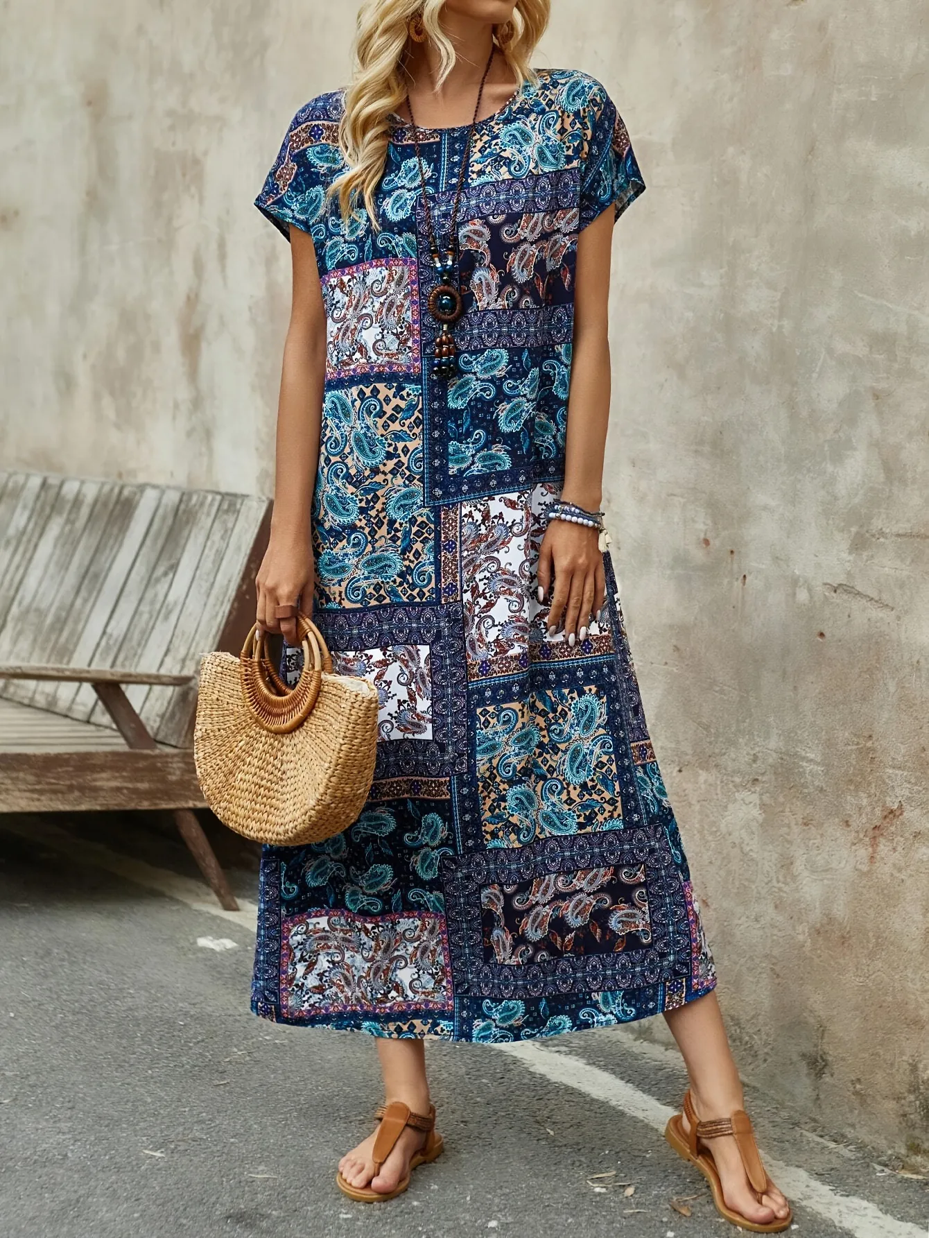 Long Printed Short Sleeve Round Neck Dress – Comfortable, Stylish, and Versatile