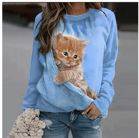 Loose Cat 3D Digital Printing Long Sleeve Crew Neck Sweater Women