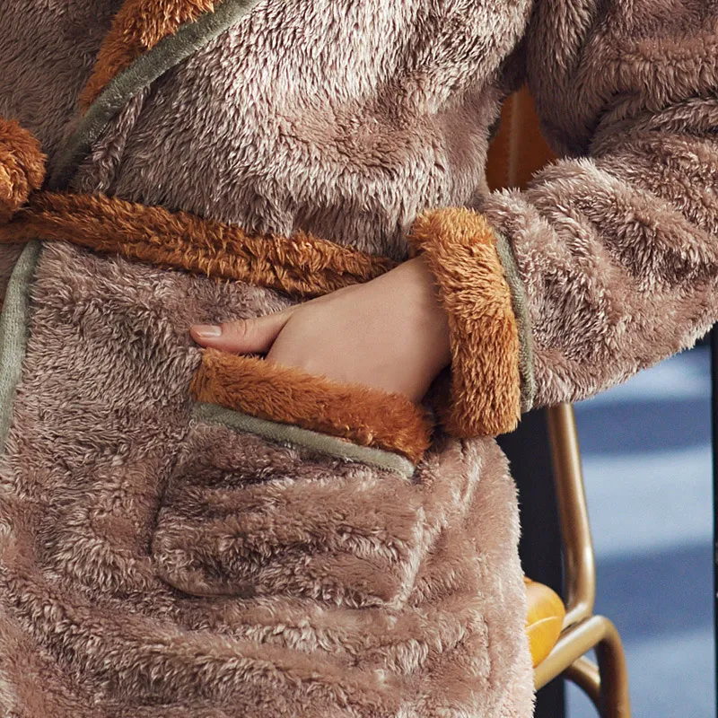 Crafted from high-quality coral velvet, these pajamas feature a three-layer quilted design that ensures optimal warmth and comfort. The thickened material provides insulation against the cold, making it perfect for winter nights. The set includes a hooded jacket and matching trousers, both adorned with charming embroidery and playful patterns, adding a touch of whimsy to your loungewear.