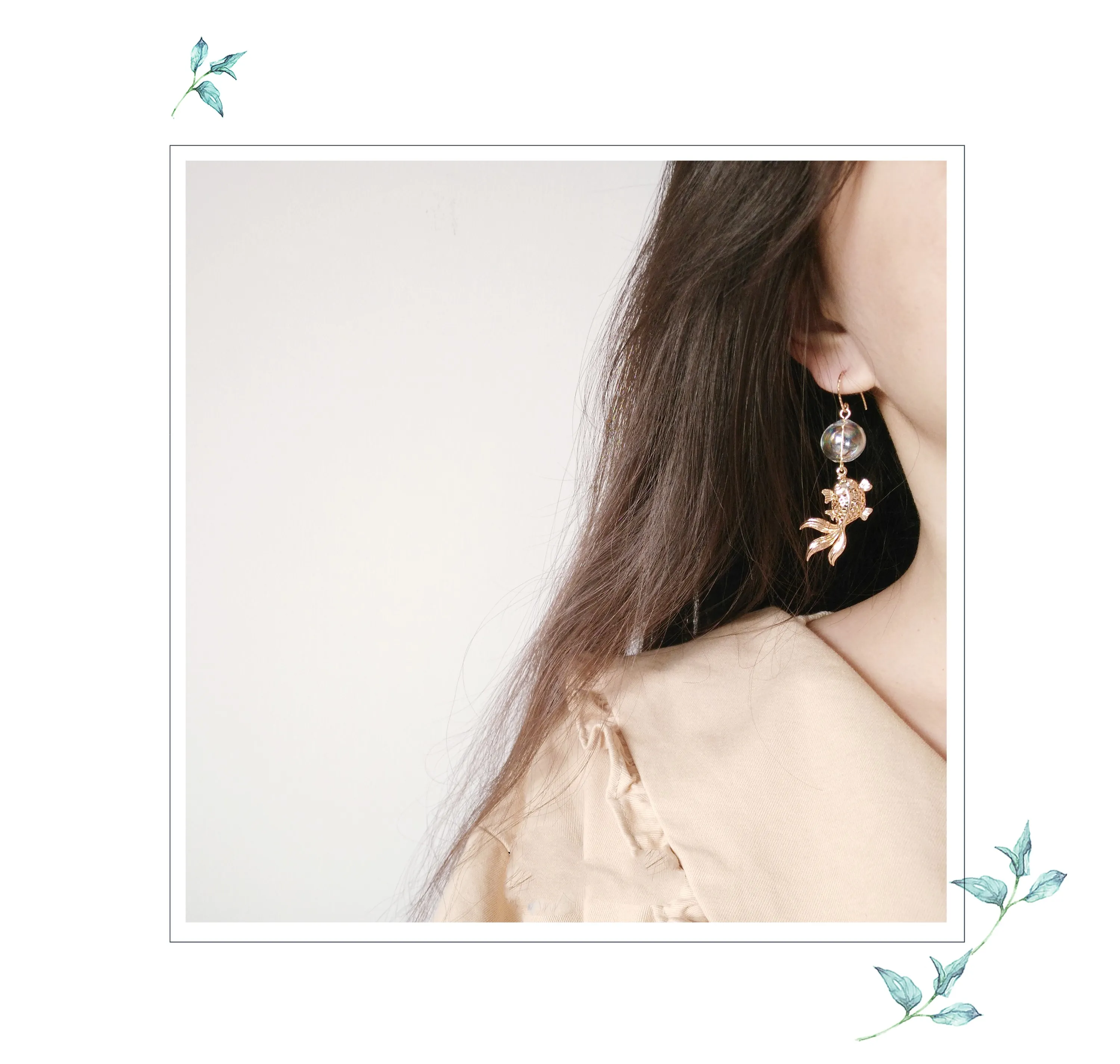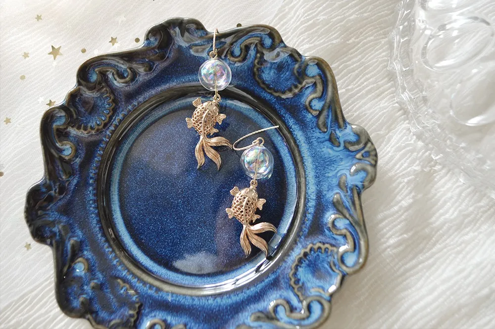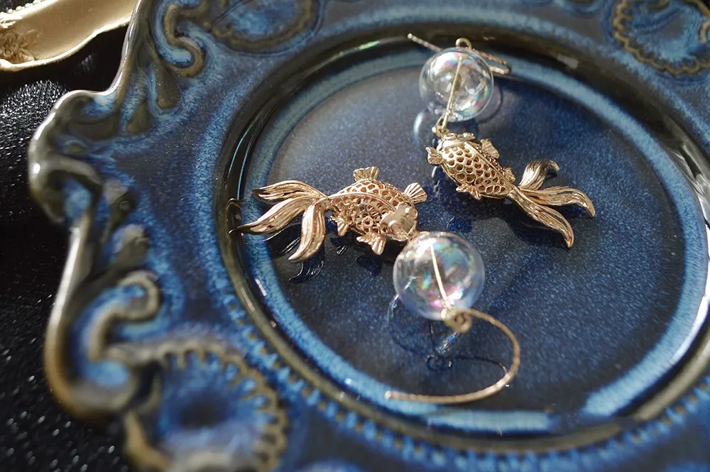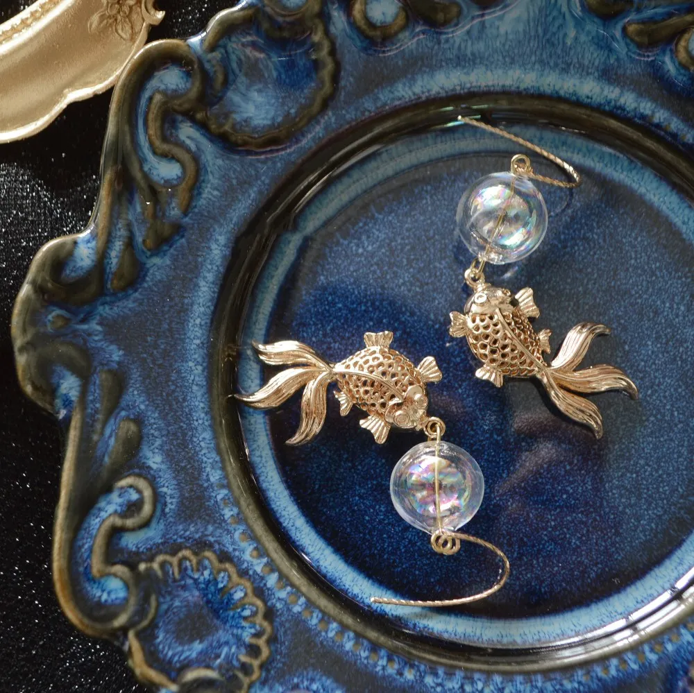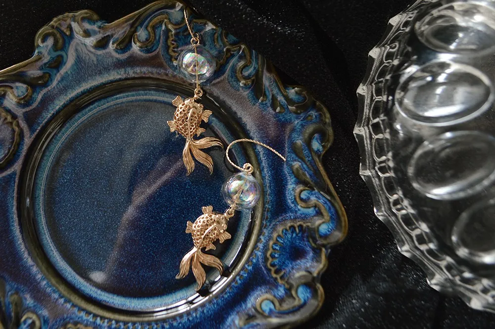 The delicate goldfish details and graceful design make these earrings a refined statement piece. They effortlessly complement both casual and formal attire, adding a touch of elegance and cultural significance.