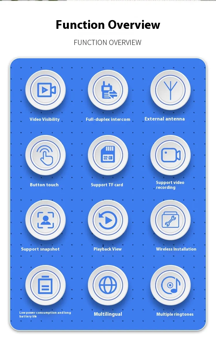 Specifications: M16A/4.3 inch/duplex two-way intercom/wireless video doorbell, M17A/4.3 inch/duplex two-way intercom/wireless video doorbell
