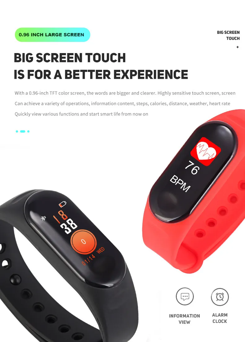 The M3 Smart Bracelet is an advanced fitness tracker designed to seamlessly integrate into your daily life, offering a range of features to monitor your health and activity levels. With its vibrant color screen, this sleek and lightweight bracelet provides real-time data on your heart rate, blood pressure, steps taken, calories burned, and more. Whether you're hitting the gym, going for a run, or simply going about your daily routine, the M3 Smart Bracelet ensures you stay informed and motivated.